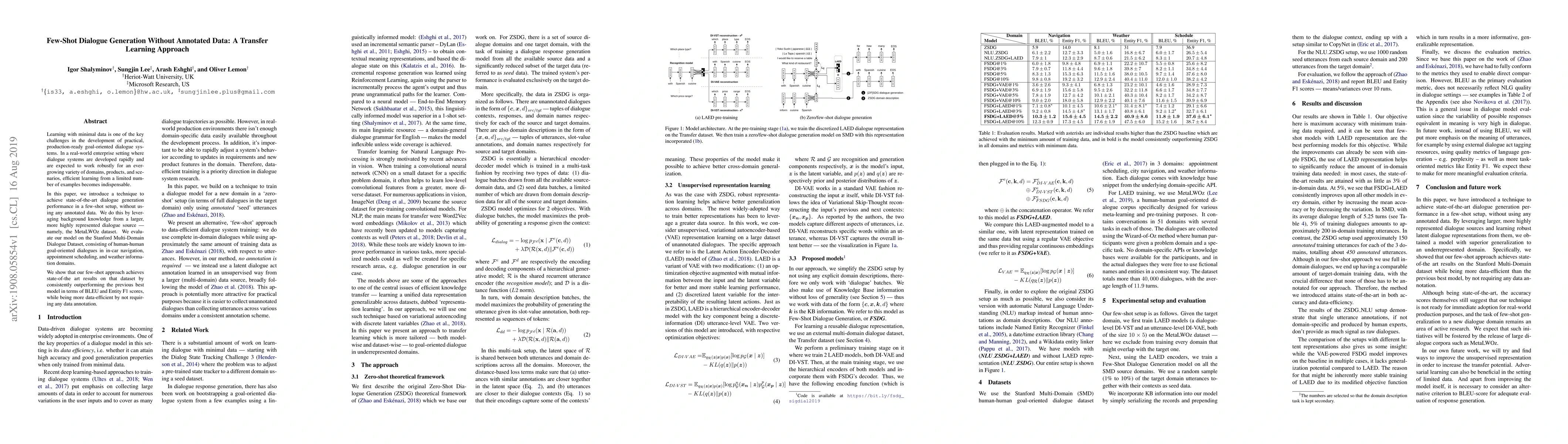 This paper presents a transfer learning approach for few-shot dialogue generation that achieves state-of-the-art performance without requiring annotated data. The method leverages background knowledge from the MetaLWOz dataset to outperform previous models on the Stanford Multi-Domain Dialogue Dataset.