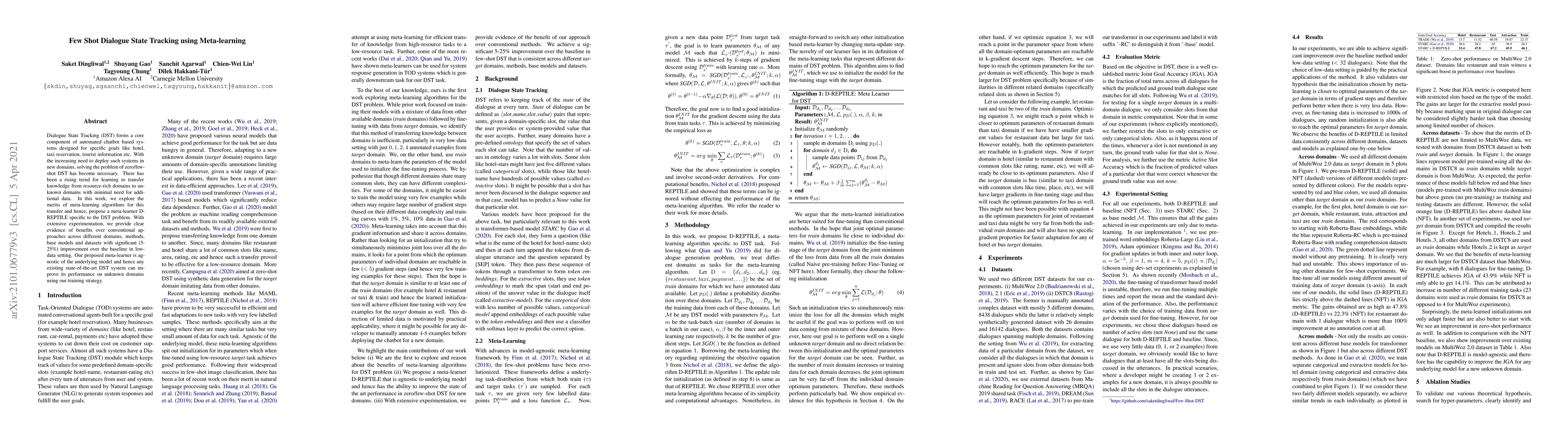 This paper proposes D-REPTILE, a meta-learning approach for few-shot Dialogue State Tracking (DST) to enable automated chatbots to function effectively in new domains with minimal data. The method shows significant improvements (5-25%) over baselines, demonstrating its effectiveness across various domains and models.