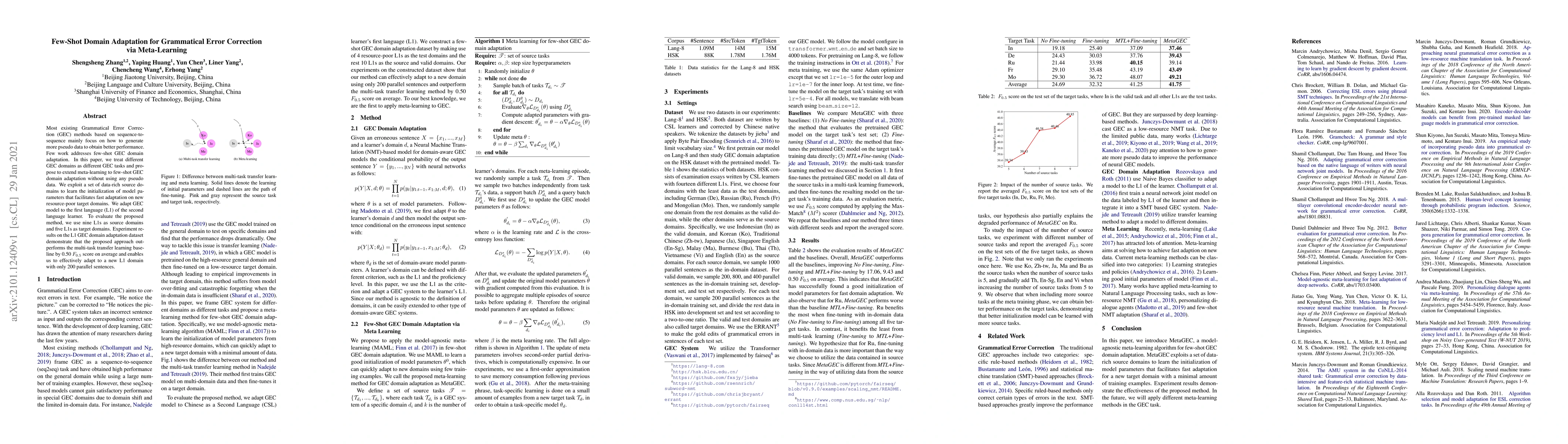 This paper proposes a meta-learning approach for few-shot grammatical error correction (GEC) domain adaptation, leveraging data-rich source domains to initialize model parameters for fast adaptation to resource-poor target domains. The method outperforms multi-task transfer learning baselines, achieving better GEC performance on new L1 domains with limited data.