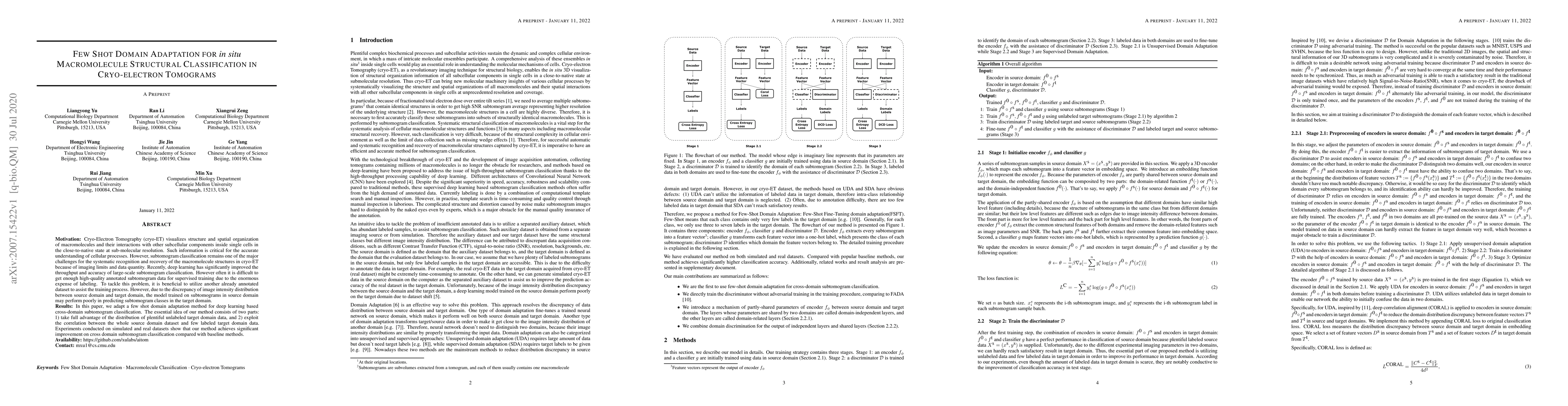 This paper proposes a few-shot domain adaptation method for deep learning to improve cross-domain subtomogram classification in cryo-electron tomography. The method leverages the distribution of abundant unlabeled target domain data and the correlation between source and labeled target domain data, achieving significant improvements over baseline methods in both simulated and real datasets.