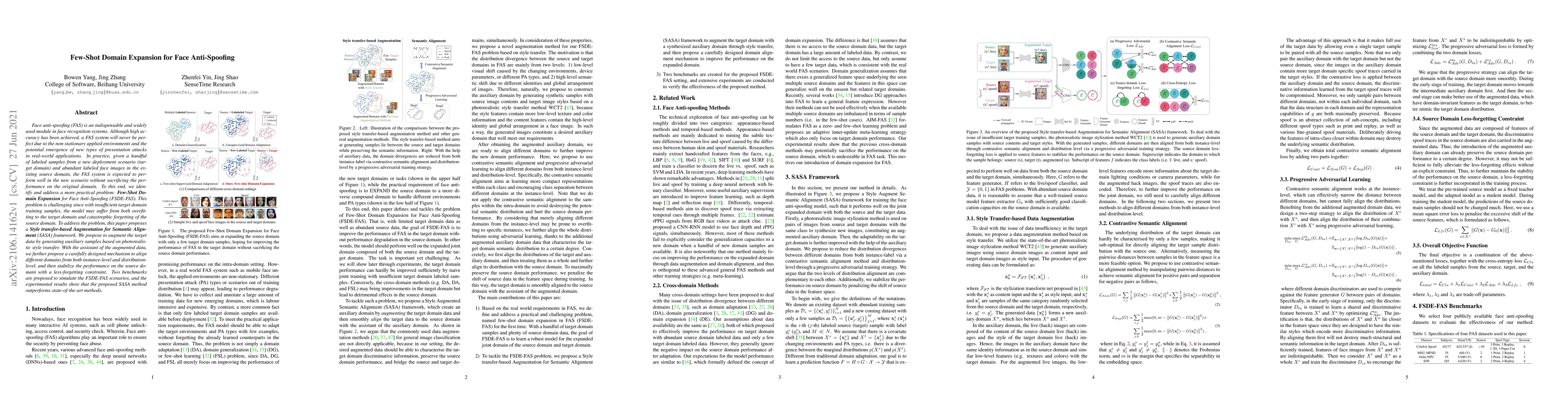 This paper addresses the challenge of Few-Shot Domain Expansion for Face Anti-Spoofing (FSDE-FAS) by proposing a Style transfer-based Augmentation for Semantic Alignment (SASA) framework. The SASA method generates auxiliary samples via photorealistic style transfer and aligns domains to stabilize performance on the source domain, achieving better results than state-of-the-art methods on two proposed benchmarks.