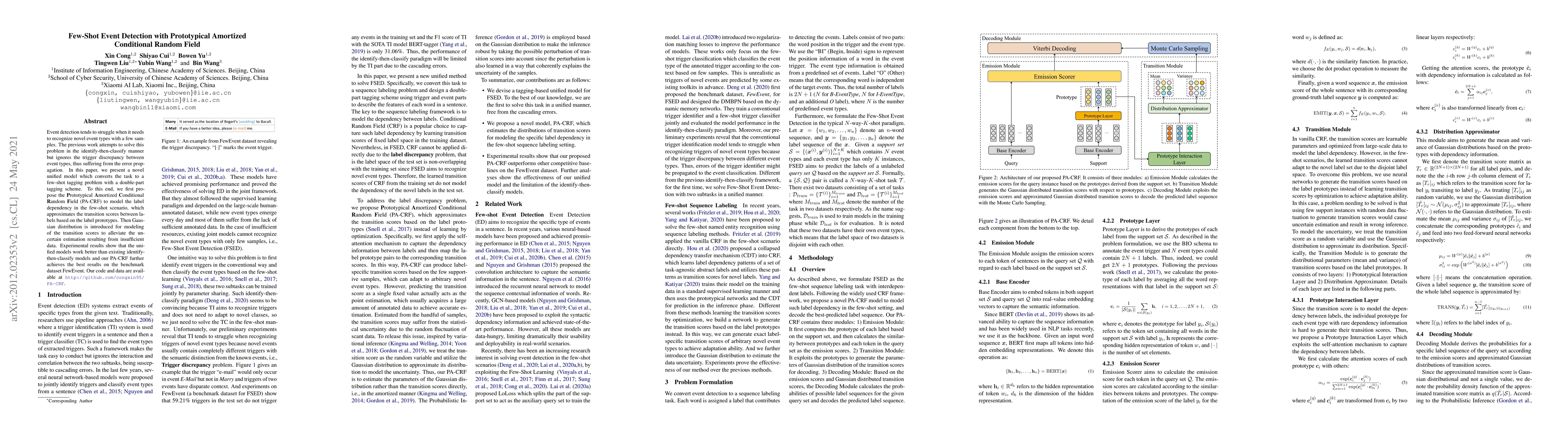 This paper introduces a novel Prototypical Amortized Conditional Random Field (PA-CRF) model for few-shot event detection, addressing the issue of trigger discrepancy by converting the task into a few-shot tagging problem. The PA-CRF approximates label transition scores based on label prototypes and uses Gaussian distributions to handle data scarcity, achieving better performance than existing identify-then-classify methods on the FewEvent benchmark.