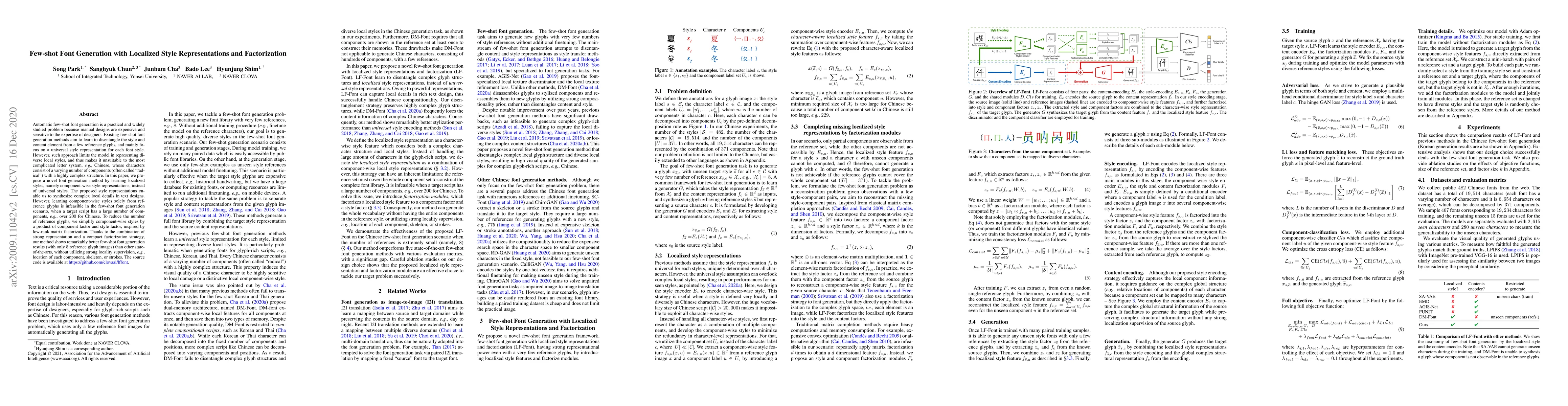This paper proposes a novel method for few-shot font generation by learning localized, component-wise style representations instead of universal styles, enabling the synthesis of complex local details. To manage the complexity of large component sets, the authors employ a factorization strategy that simplifies component-wise styles, resulting in superior performance with minimal reference glyphs.