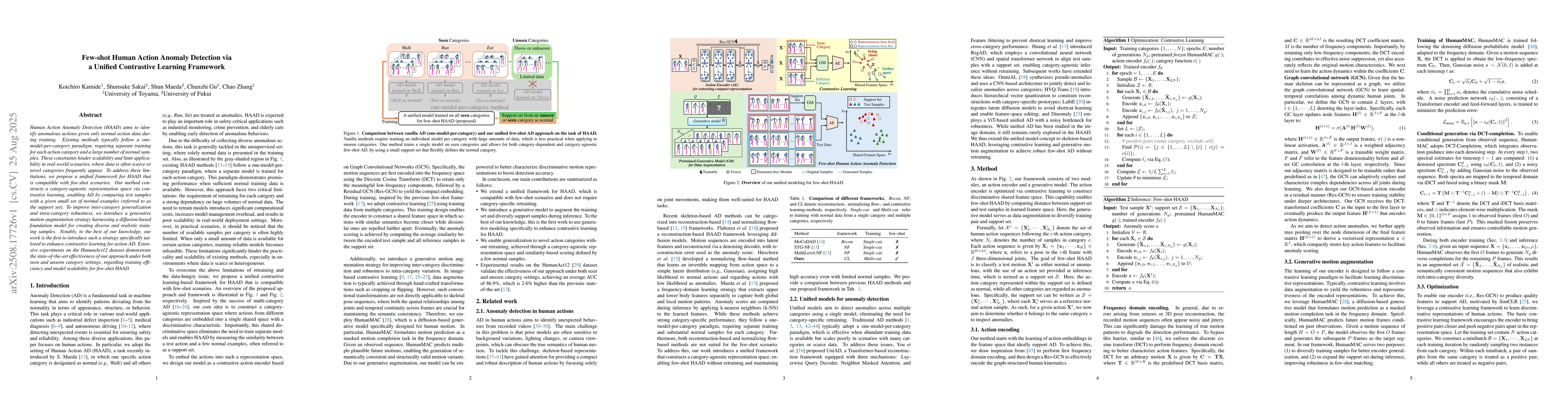 Human Action Anomaly Detection (HAAD) aims to identify anomalous actions given only normal action data during training. Existing methods typically follow a one-model-per-category paradigm, requiring separate training for each action category and a large number of normal samples. These constraints hinder scalability and limit applicability in real-world scenarios, where data is often scarce or novel categories frequently appear. To address these limitations, we propose a unified framework for HAAD that is compatible with few-shot scenarios. Our method constructs a category-agnostic representation space via contrastive learning, enabling AD by comparing test samples with a given small set of normal examples (referred to as the support set). To improve inter-category generalization and intra-category robustness, we introduce a generative motion augmentation strategy harnessing a diffusion-based foundation model for creating diverse and realistic training samples. Notably, to the best of our knowledge, our work is the first to introduce such a strategy specifically tailored to enhance contrastive learning for action AD. Extensive experiments on the HumanAct12 dataset demonstrate the state-of-the-art effectiveness of our approach under both seen and unseen category settings, regarding training efficiency and model scalability for few-shot HAAD.