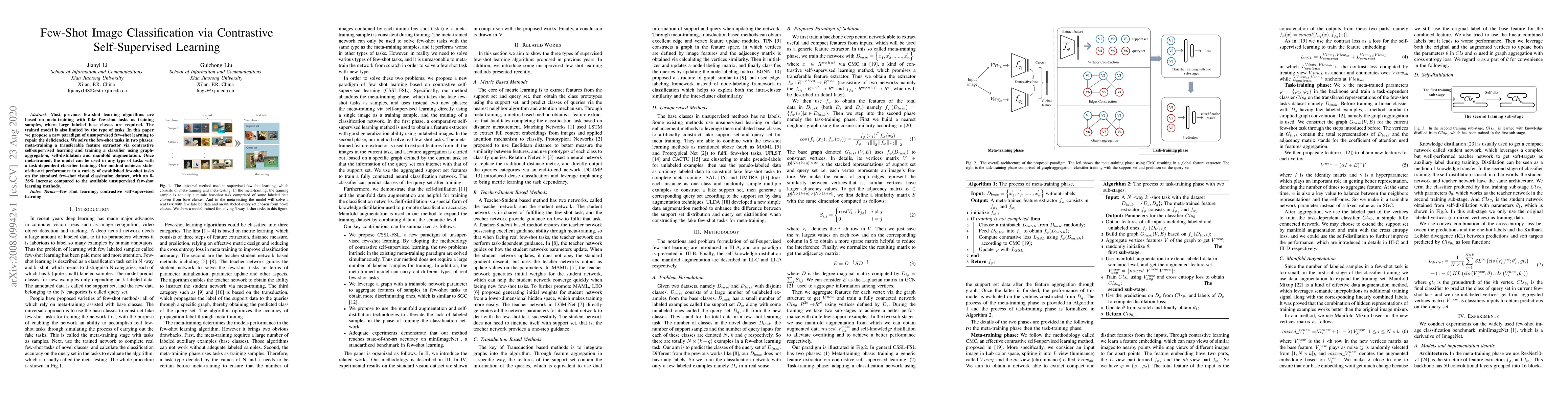 Most previous few-shot learning algorithms are based on meta-training with fake few-shot tasks as training samples, where large labeled base classes are required. The trained model is also limited by the type of tasks. In this paper we propose a new paradigm of unsupervised few-shot learning to repair the deficiencies. We solve the few-shot tasks in two phases: meta-training a transferable feature extractor via contrastive self-supervised learning and training a classifier using graph aggregation, self-distillation and manifold augmentation. Once meta-trained, the model can be used in any type of tasks with a task-dependent classifier training. Our method achieves state of-the-art performance in a variety of established few-shot tasks on the standard few-shot visual classification datasets, with an 8- 28% increase compared to the available unsupervised few-shot learning methods.
