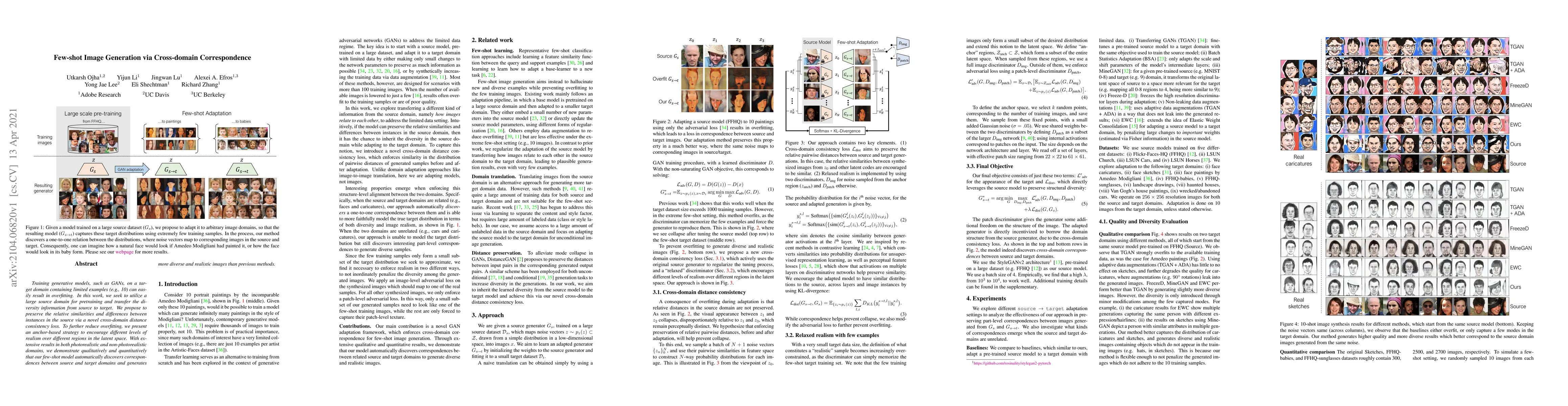 Training generative models, such as GANs, on a target domain containing limited examples (e.g., 10) can easily result in overfitting. In this work, we seek to utilize a large source domain for pretraining and transfer the diversity information from source to target. We propose to preserve the relative similarities and differences between instances in the source via a novel cross-domain distance consistency loss. To further reduce overfitting, we present an anchor-based strategy to encourage different levels of realism over different regions in the latent space. With extensive results in both photorealistic and non-photorealistic domains, we demonstrate qualitatively and quantitatively that our few-shot model automatically discovers correspondences between source and target domains and generates more diverse and realistic images than previous methods.
