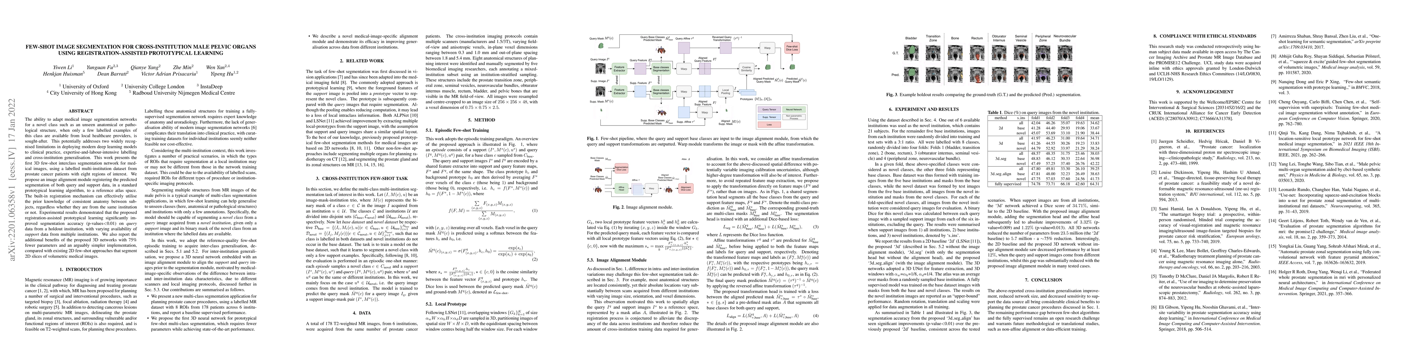 This paper introduces a novel 3D few-shot segmentation network for male pelvic organs using registration-assisted prototypical learning, which significantly improves cross-institution generalisation and reduces labelling effort. The proposed method shows enhanced segmentation accuracy and requires fewer parameters compared to existing 2D approaches.