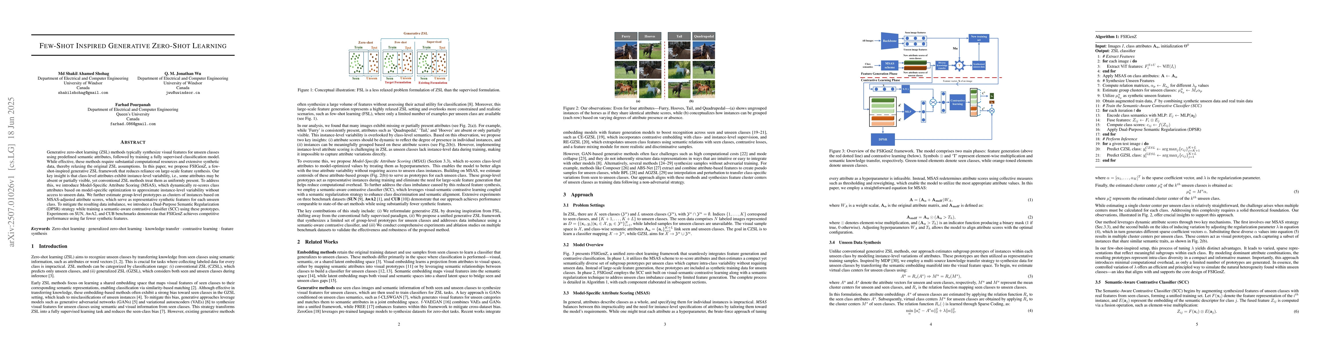 Generative zero-shot learning (ZSL) methods typically synthesize visual features for unseen classes using predefined semantic attributes, followed by training a fully supervised classification model. While effective, these methods require substantial computational resources and extensive synthetic data, thereby relaxing the original ZSL assumptions. In this paper, we propose FSIGenZ, a few-shot-inspired generative ZSL framework that reduces reliance on large-scale feature synthesis. Our key insight is that class-level attributes exhibit instance-level variability, i.e., some attributes may be absent or partially visible, yet conventional ZSL methods treat them as uniformly present. To address this, we introduce Model-Specific Attribute Scoring (MSAS), which dynamically re-scores class attributes based on model-specific optimization to approximate instance-level variability without access to unseen data. We further estimate group-level prototypes as clusters of instances based on MSAS-adjusted attribute scores, which serve as representative synthetic features for each unseen class. To mitigate the resulting data imbalance, we introduce a Dual-Purpose Semantic Regularization (DPSR) strategy while training a semantic-aware contrastive classifier (SCC) using these prototypes. Experiments on SUN, AwA2, and CUB benchmarks demonstrate that FSIGenZ achieves competitive performance using far fewer synthetic features.