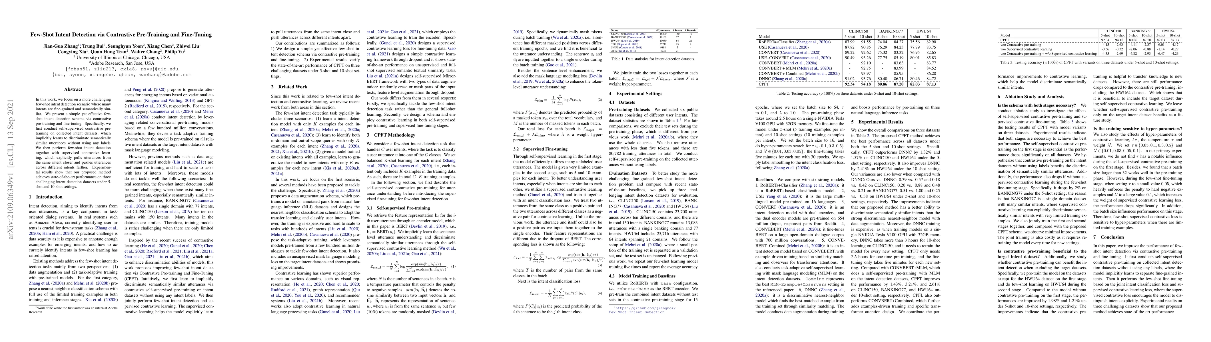This paper presents a few-shot intent detection method using contrastive pre-training and fine-tuning, achieving state-of-the-art results on three datasets by leveraging self-supervised learning to discriminate fine-grained, semantically similar intents. The approach combines pre-training to distinguish utterances and fine-tuning with supervised contrastive learning for explicit intent separation.