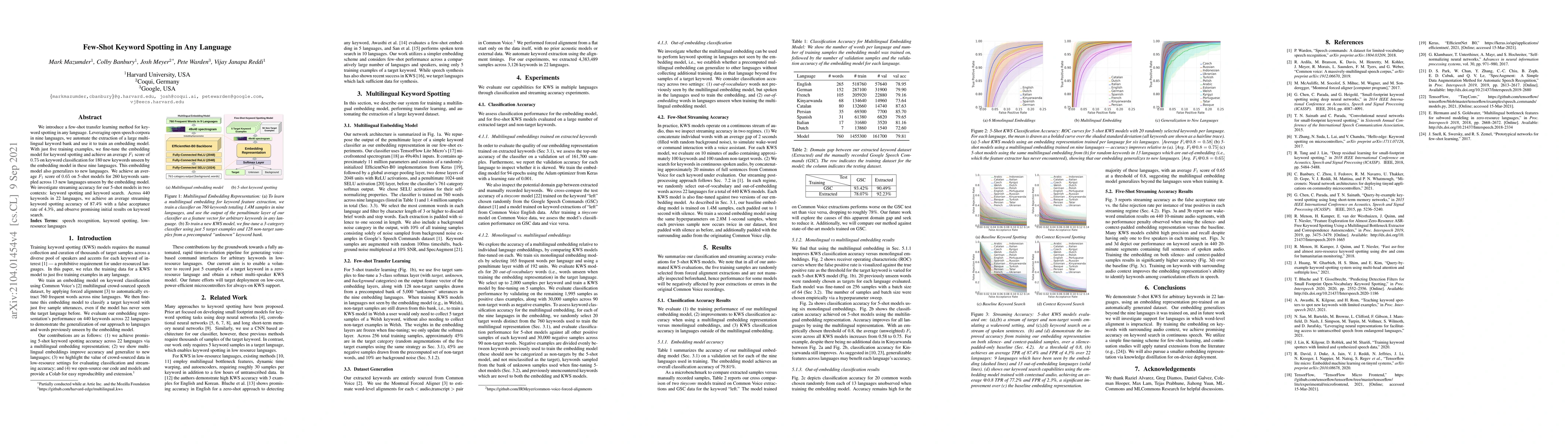 We introduce a few-shot transfer learning method for keyword spotting in any language. Leveraging open speech corpora in nine languages, we automate the extraction of a large multilingual keyword bank and use it to train an embedding model. With just five training examples, we fine-tune the embedding model for keyword spotting and achieve an average F1 score of 0.75 on keyword classification for 180 new keywords unseen by the embedding model in these nine languages. This embedding model also generalizes to new languages. We achieve an average F1 score of 0.65 on 5-shot models for 260 keywords sampled across 13 new languages unseen by the embedding model. We investigate streaming accuracy for our 5-shot models in two contexts: keyword spotting and keyword search. Across 440 keywords in 22 languages, we achieve an average streaming keyword spotting accuracy of 87.4% with a false acceptance rate of 4.3%, and observe promising initial results on keyword search.