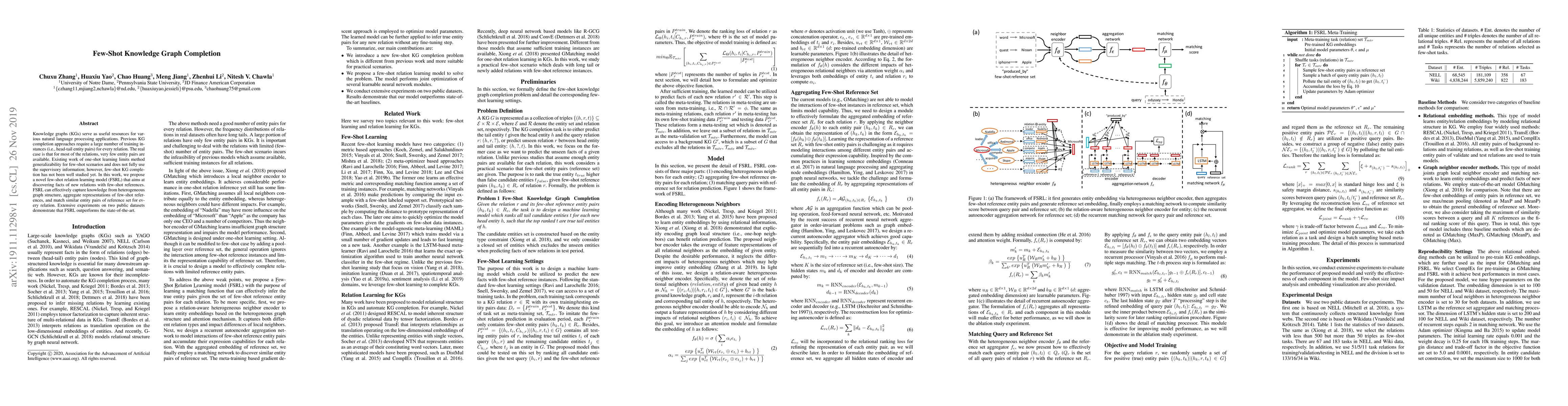 This paper proposes FSRL, a novel few-shot learning model for knowledge graph completion, which aims to discover new relation facts with minimal training instances. FSRL leverages heterogeneous graph structures and outperforms existing methods in experiments on public datasets.