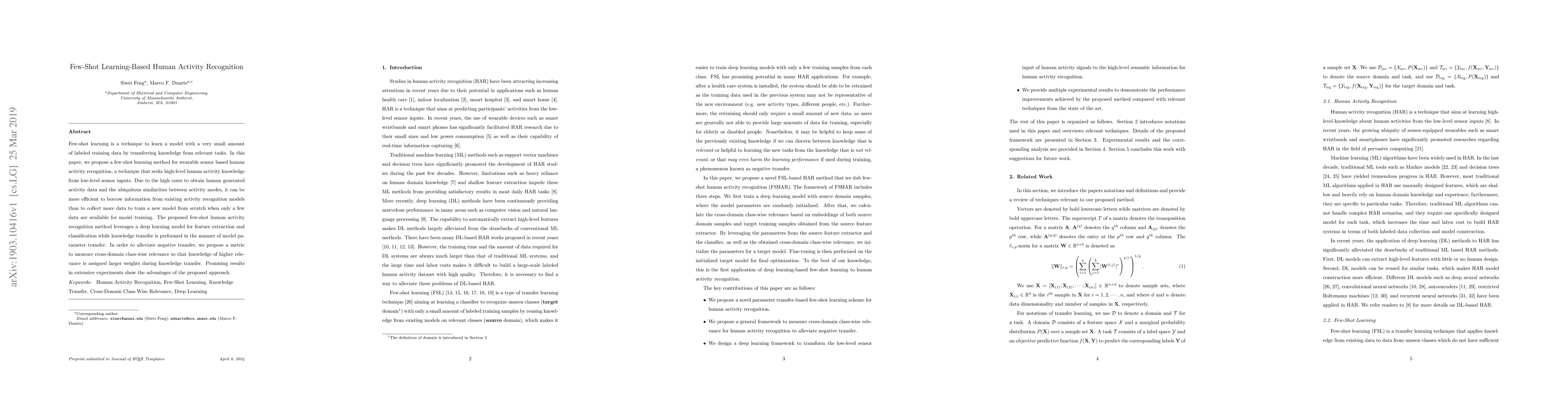 This paper proposes a few-shot learning method for human activity recognition using wearable sensors, leveraging deep learning for feature extraction and classification. It employs knowledge transfer via model parameter adjustment, with a metric to prioritize relevant knowledge to mitigate negative transfer, demonstrating promising results in experiments.