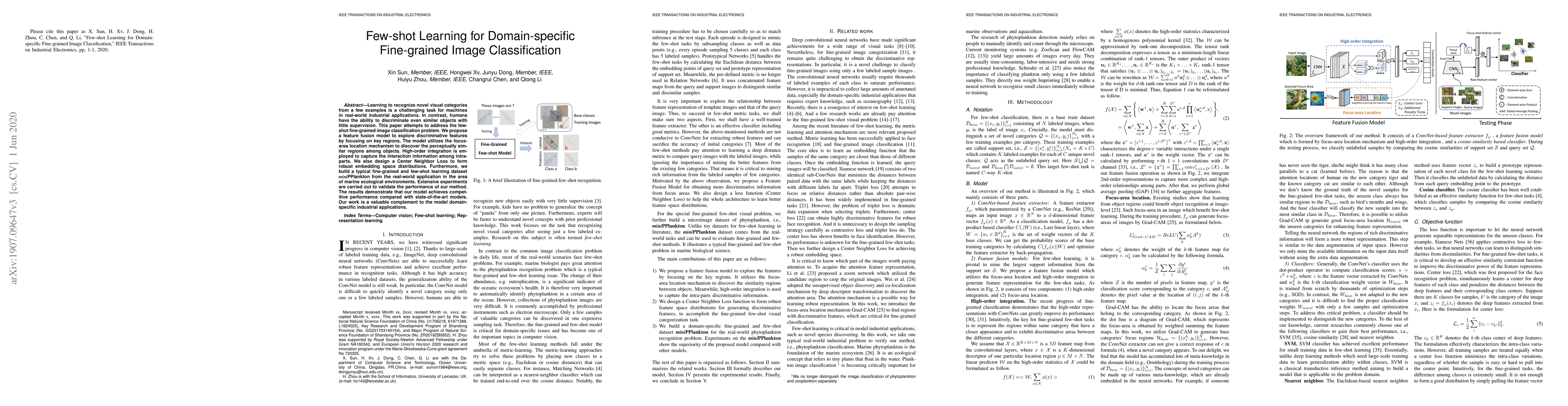 Learning to recognize novel visual categories from a few examples is a challenging task for machines in real-world industrial applications. In contrast, humans have the ability to discriminate even similar objects with little supervision. This paper attempts to address the few shot fine-grained image classification problem. We propose a feature fusion model to explore discriminative features by focusing on key regions. The model utilizes the focus area location mechanism to discover the perceptually similar regions among objects. High-order integration is employed to capture the interaction information among intra-parts. We also design a Center Neighbor Loss to form robust embedding space distributions. Furthermore, we build a typical fine-grained and few-shot learning dataset miniPPlankton from the real-world application in the area of marine ecological environments. Extensive experiments are carried out to validate the performance of our method. The results demonstrate that our model achieves competitive performance compared with state-of-the-art models. Our work is a valuable complement to the model domain-specific industrial applications.