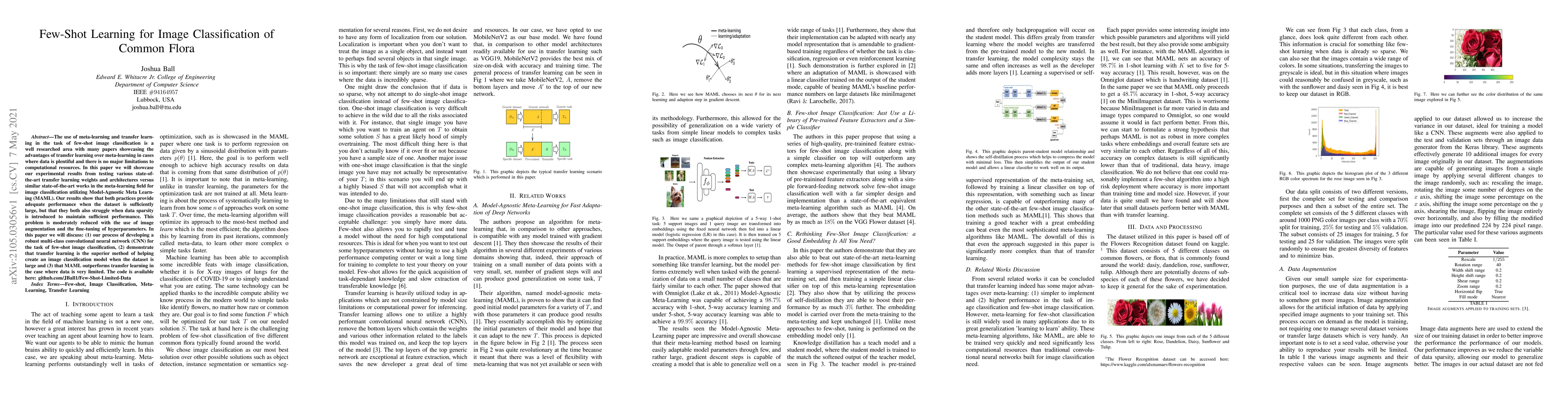 This research investigates the comparative performance of transfer learning and meta-learning for few-shot image classification of common flora. The study finds that while transfer learning excels with large datasets, meta-learning, specifically Model-Agnostic Meta Learning (MAML), is more effective under data scarcity. The paper also highlights the benefits of image augmentation and fine-tuning to mitigate performance drops in sparse data scenarios. For further details, please refer to the full paper and the provided code repository.