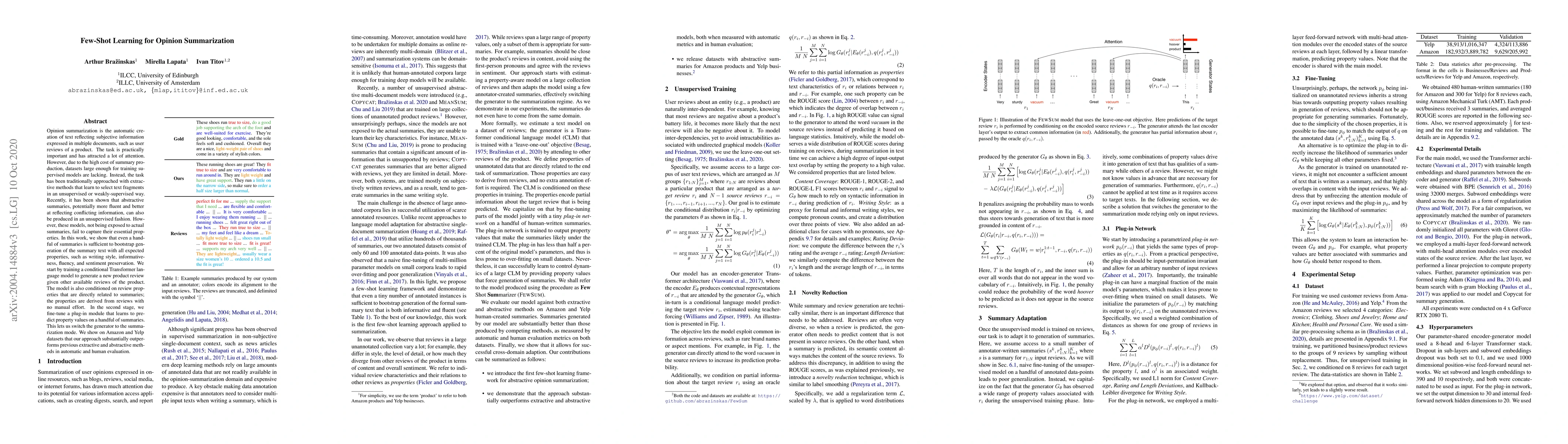 Opinion summarization is the automatic creation of text reflecting subjective information expressed in multiple documents, such as user reviews of a product. The task is practically important and has attracted a lot of attention. However, due to the high cost of summary production, datasets large enough for training supervised models are lacking. Instead, the task has been traditionally approached with extractive methods that learn to select text fragments in an unsupervised or weakly-supervised way. Recently, it has been shown that abstractive summaries, potentially more fluent and better at reflecting conflicting information, can also be produced in an unsupervised fashion. However, these models, not being exposed to actual summaries, fail to capture their essential properties. In this work, we show that even a handful of summaries is sufficient to bootstrap generation of the summary text with all expected properties, such as writing style, informativeness, fluency, and sentiment preservation. We start by training a conditional Transformer language model to generate a new product review given other available reviews of the product. The model is also conditioned on review properties that are directly related to summaries; the properties are derived from reviews with no manual effort. In the second stage, we fine-tune a plug-in module that learns to predict property values on a handful of summaries. This lets us switch the generator to the summarization mode. We show on Amazon and Yelp datasets that our approach substantially outperforms previous extractive and abstractive methods in automatic and human evaluation.