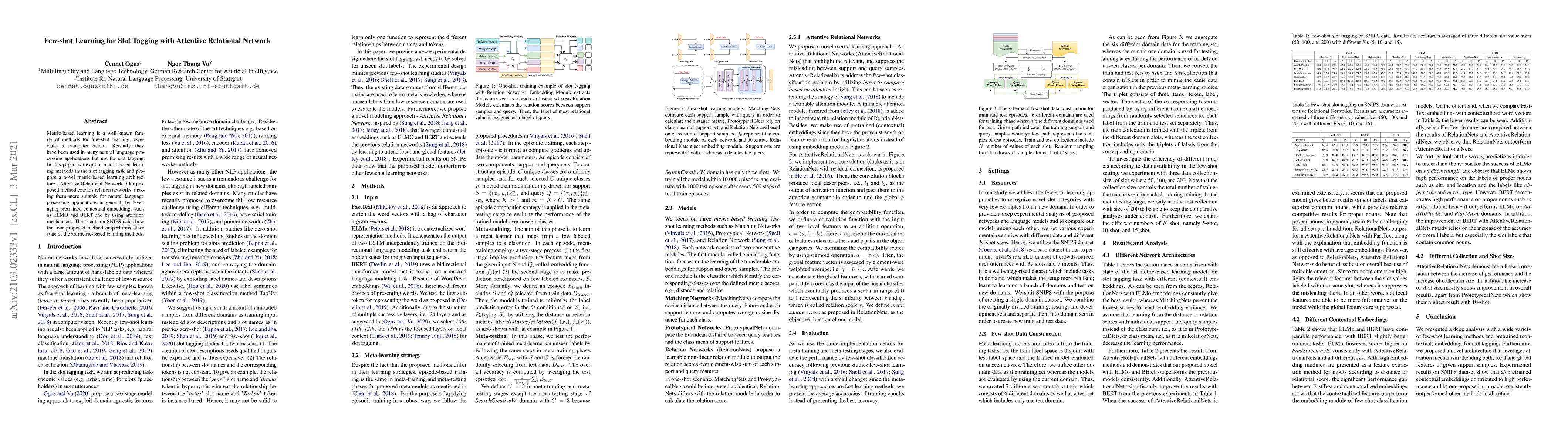 This paper introduces the Attentive Relational Network, a novel metric-based learning architecture for few-shot slot tagging in natural language processing. It leverages pretrained contextual embeddings like ELMO and BERT, and an attention mechanism, outperforming other metric-based methods on the SNIPS dataset.