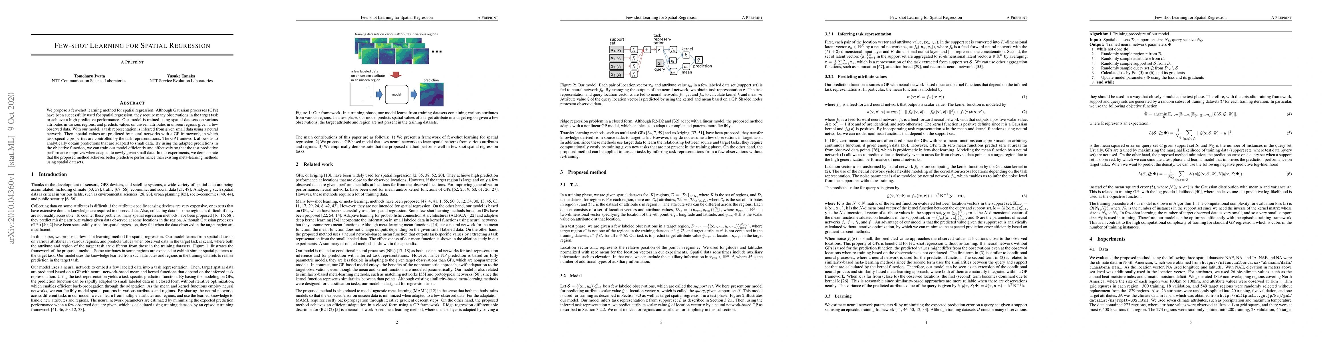 This paper introduces a few-shot learning method for spatial regression that leverages neural networks and Gaussian processes to predict values in unseen regions with limited data. The model efficiently adapts predictions using task representations, achieving better performance than existing meta-learning methods.