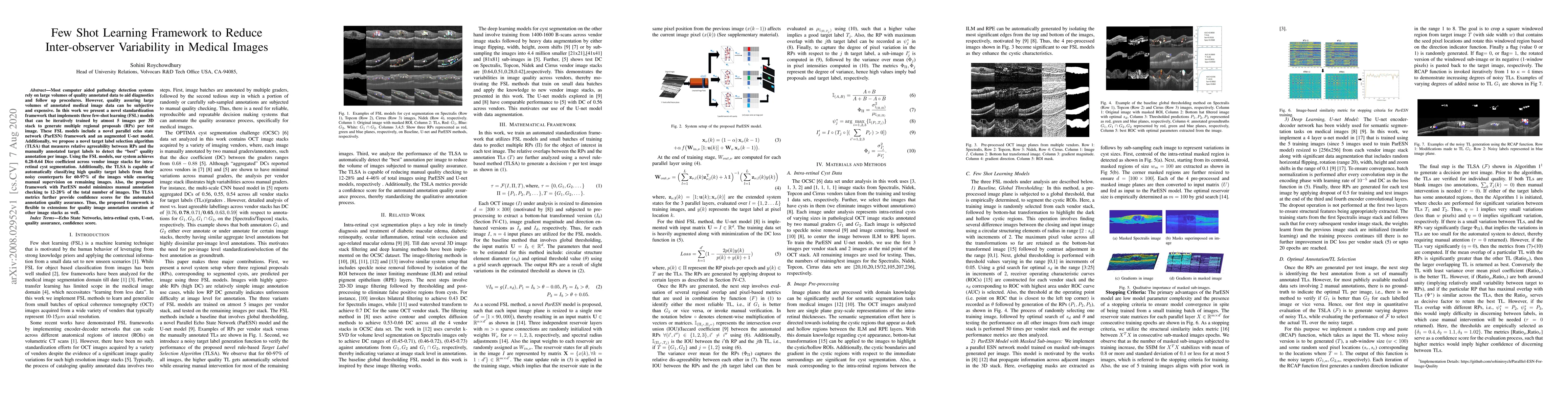 This paper presents a few-shot learning framework to reduce inter-observer variability in medical image annotation, utilizing three FSL models, including a ParESN and an augmented U-net, to achieve high segmentation accuracy with minimal manual supervision. The proposed target label selection algorithm effectively identifies high-quality annotations, significantly reducing the need for manual annotation verification.