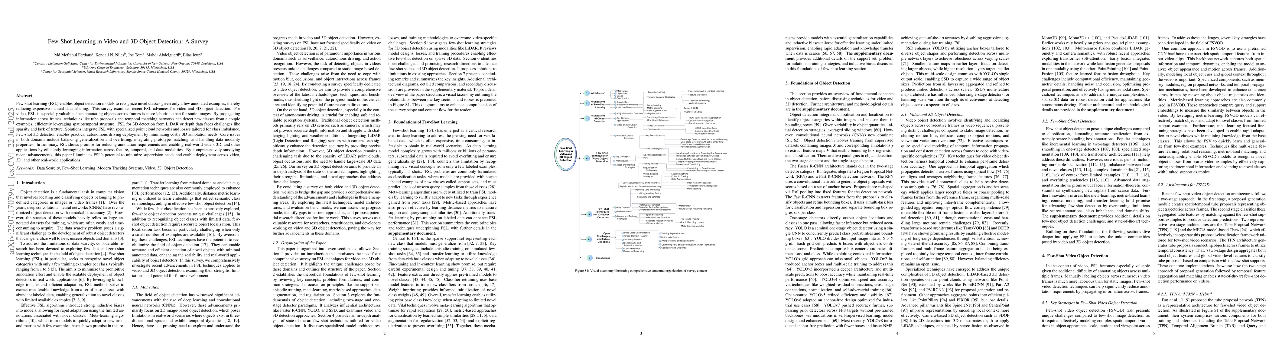 Few-shot learning (FSL) enables object detection models to recognize novel classes given only a few annotated examples, thereby reducing expensive manual data labeling. This survey examines recent FSL advances for video and 3D object detection. For video, FSL is especially valuable since annotating objects across frames is more laborious than for static images. By propagating information across frames, techniques like tube proposals and temporal matching networks can detect new classes from a couple examples, efficiently leveraging spatiotemporal structure. FSL for 3D detection from LiDAR or depth data faces challenges like sparsity and lack of texture. Solutions integrate FSL with specialized point cloud networks and losses tailored for class imbalance. Few-shot 3D detection enables practical autonomous driving deployment by minimizing costly 3D annotation needs. Core issues in both domains include balancing generalization and overfitting, integrating prototype matching, and handling data modality properties. In summary, FSL shows promise for reducing annotation requirements and enabling real-world video, 3D, and other applications by efficiently leveraging information across feature, temporal, and data modalities. By comprehensively surveying recent advancements, this paper illuminates FSL's potential to minimize supervision needs and enable deployment across video, 3D, and other real-world applications.