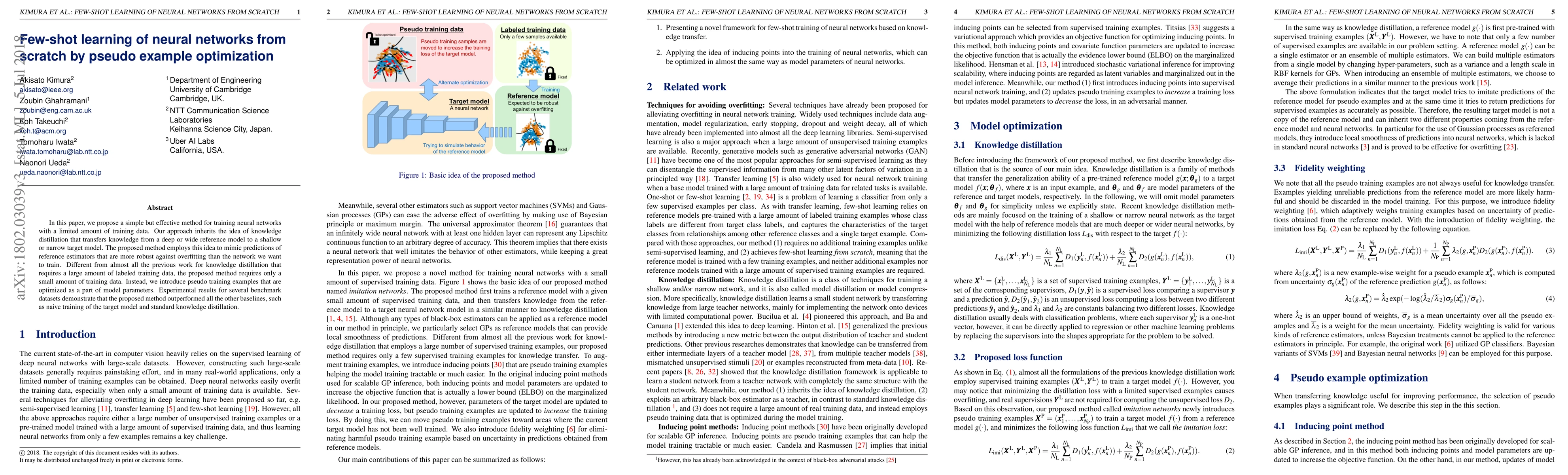 In this paper, we propose a simple but effective method for training neural networks with a limited amount of training data. Our approach inherits the idea of knowledge distillation that transfers knowledge from a deep or wide reference model to a shallow or narrow target model. The proposed method employs this idea to mimic predictions of reference estimators that are more robust against overfitting than the network we want to train. Different from almost all the previous work for knowledge distillation that requires a large amount of labeled training data, the proposed method requires only a small amount of training data. Instead, we introduce pseudo training examples that are optimized as a part of model parameters. Experimental results for several benchmark datasets demonstrate that the proposed method outperformed all the other baselines, such as naive training of the target model and standard knowledge distillation.