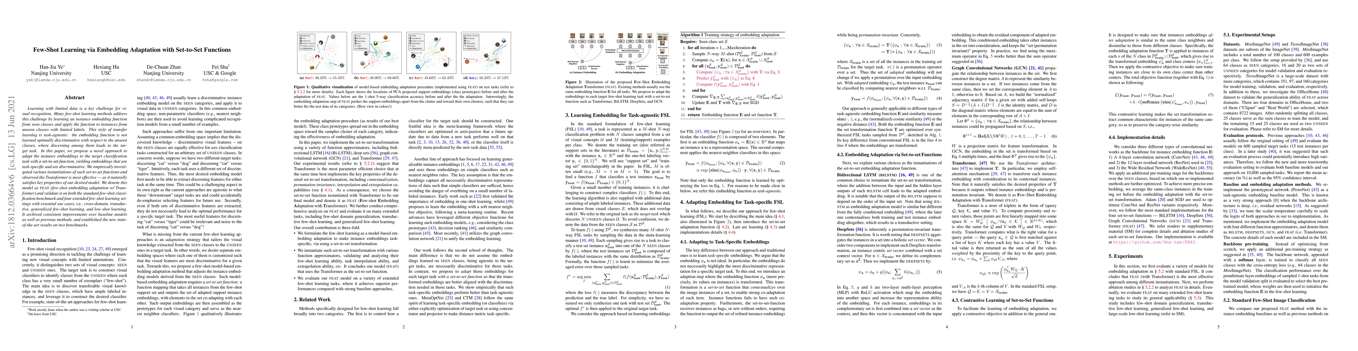 This paper introduces FEAT, a novel few-shot learning method that adapts instance embeddings using set-to-set functions, specifically leveraging the Transformer architecture to yield task-specific, discriminative embeddings. The proposed approach consistently outperforms baselines across various few-shot learning settings, establishing new state-of-the-art results on two benchmarks.