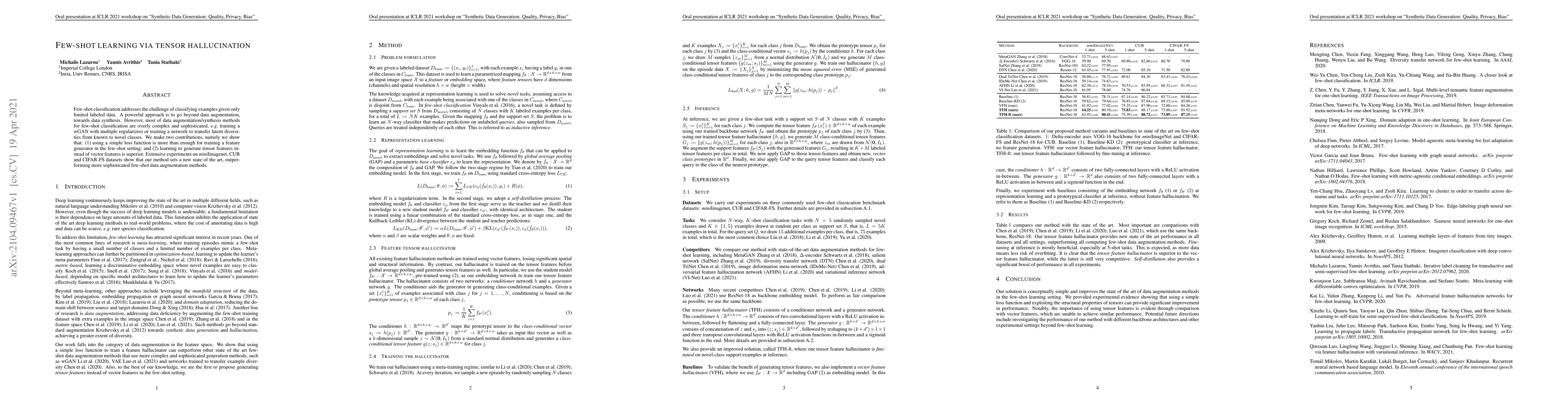 This paper proposes a simple yet effective few-shot learning method using tensor hallucination to generate superior tensor features instead of vector features, demonstrating state-of-the-art performance on miniImagenet, CUB, and CIFAR-FS datasets. The authors show that a straightforward loss function suffices for training the feature generator, bypassing the complexity of other data augmentation methods.