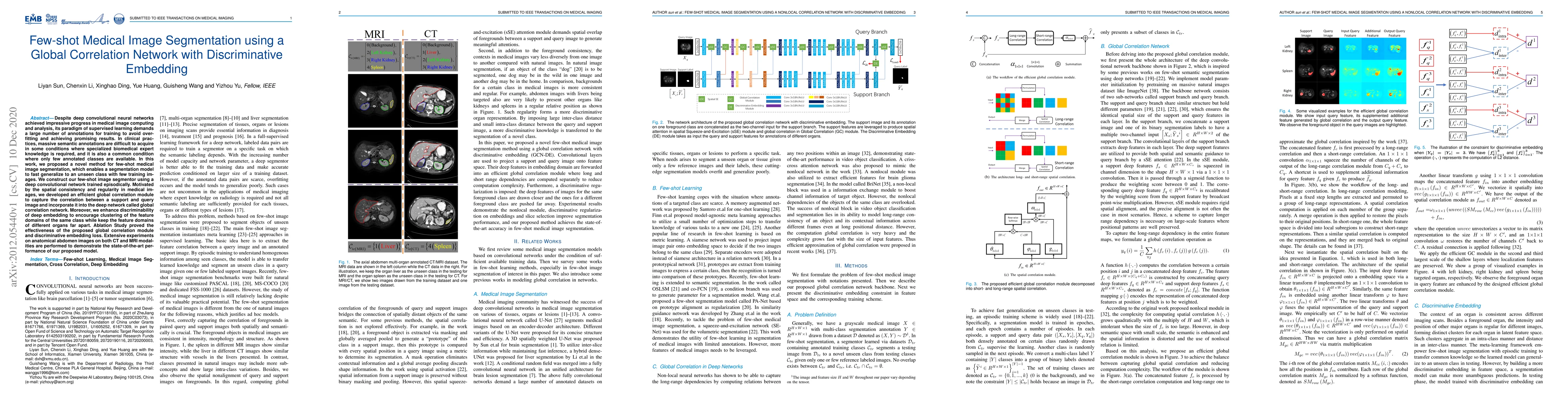 Despite deep convolutional neural networks achieved impressive progress in medical image computing and analysis, its paradigm of supervised learning demands a large number of annotations for training to avoid overfitting and achieving promising results. In clinical practices, massive semantic annotations are difficult to acquire in some conditions where specialized biomedical expert knowledge is required, and it is also a common condition where only few annotated classes are available. In this work, we proposed a novel method for few-shot medical image segmentation, which enables a segmentation model to fast generalize to an unseen class with few training images. We construct our few-shot image segmentor using a deep convolutional network trained episodically. Motivated by the spatial consistency and regularity in medical images, we developed an efficient global correlation module to capture the correlation between a support and query image and incorporate it into the deep network called global correlation network. Moreover, we enhance discriminability of deep embedding to encourage clustering of the feature domains of the same class while keep the feature domains of different organs far apart. Ablation Study proved the effectiveness of the proposed global correlation module and discriminative embedding loss. Extensive experiments on anatomical abdomen images on both CT and MRI modalities are performed to demonstrate the state-of-the-art performance of our proposed model.