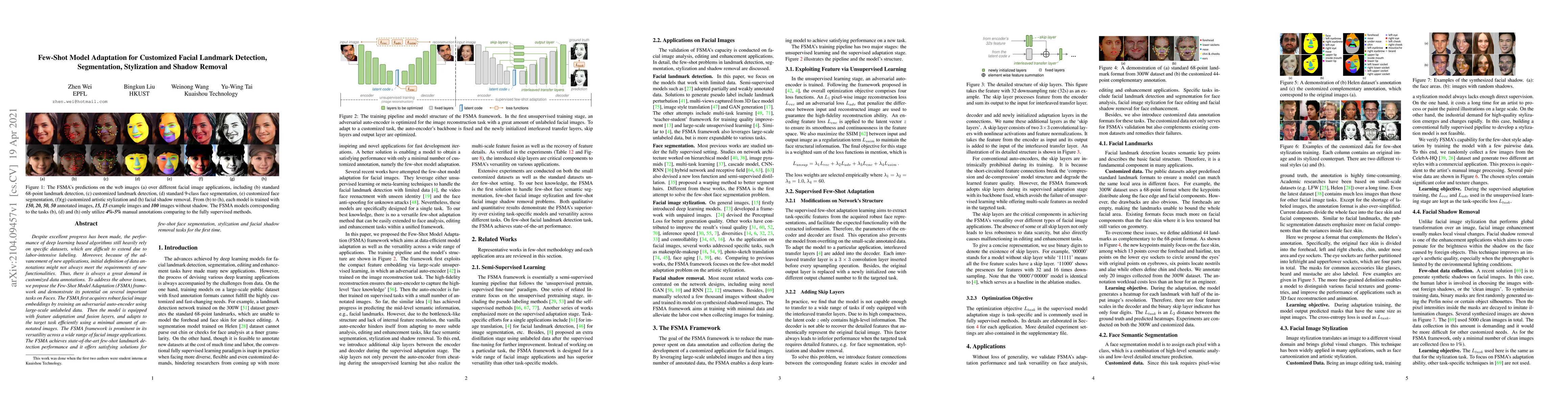 The paper proposes the Few-Shot Model Adaptation (FSMA) framework to efficiently adapt deep learning models for facial landmark detection, segmentation, stylization, and shadow removal using minimal annotated data. The FSMA leverages adversarial auto-encoders for robust facial embeddings and feature adaptation layers to achieve state-of-the-art few-shot performance across these tasks.