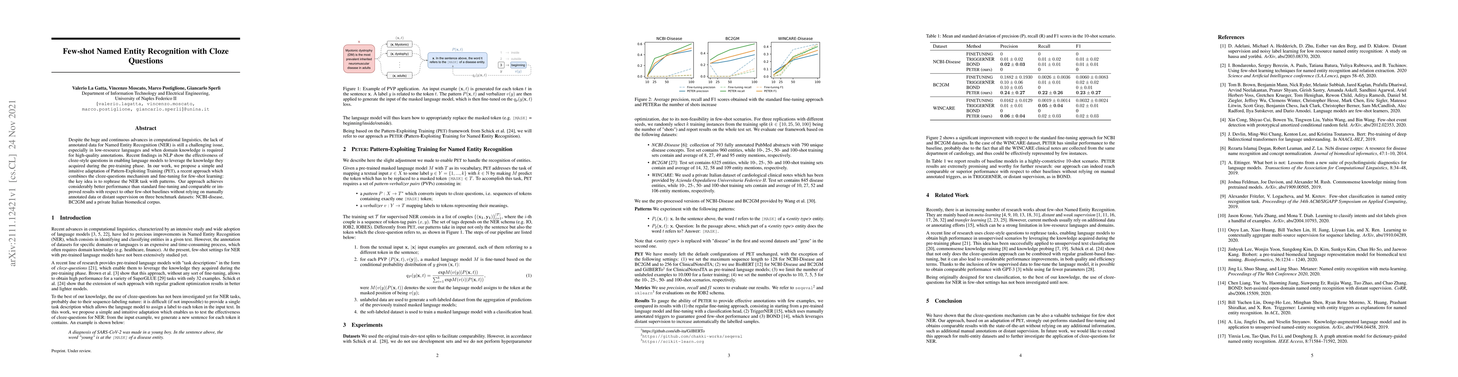 This paper proposes a few-shot Named Entity Recognition (NER) method using cloze questions and Pattern-Exploiting Training (PET) to address the lack of annotated data, achieving better performance than standard fine-tuning on three benchmark datasets.