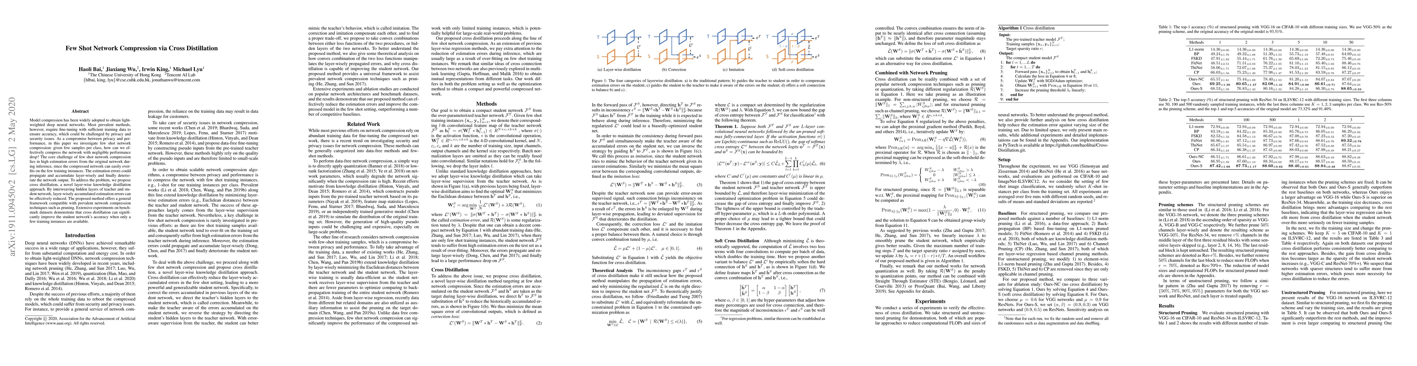 This paper proposes a novel cross distillation method for few-shot network compression, aiming to minimize performance drop with limited training data. The approach interweaves hidden layers of teacher and student networks to reduce layer-wise estimation errors, significantly improving the accuracy of compressed networks with few training samples.