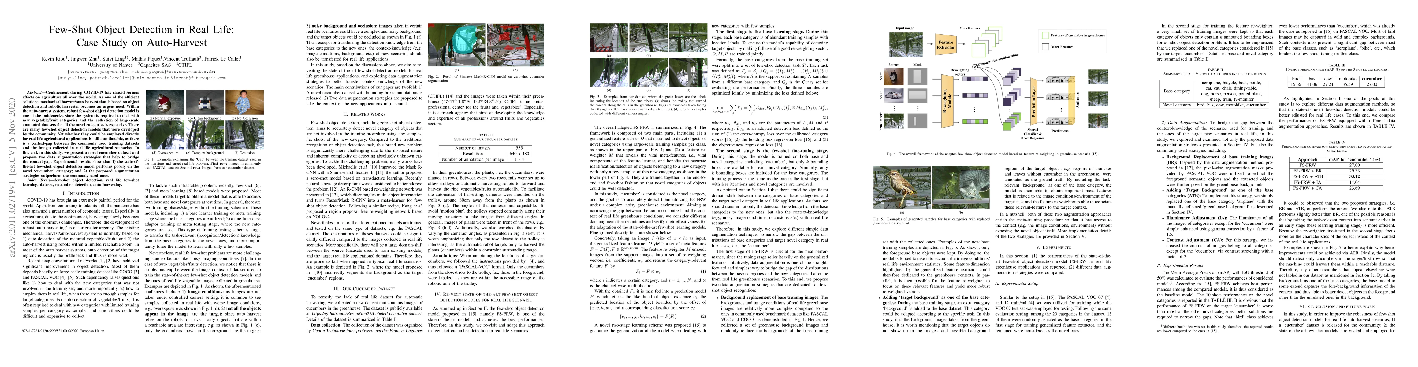 Confinement during COVID-19 has caused serious effects on agriculture all over the world. As one of the efficient solutions, mechanical harvest/auto-harvest that is based on object detection and robotic harvester becomes an urgent need. Within the auto-harvest system, robust few-shot object detection model is one of the bottlenecks, since the system is required to deal with new vegetable/fruit categories and the collection of large-scale annotated datasets for all the novel categories is expensive. There are many few-shot object detection models that were developed by the community. Yet whether they could be employed directly for real life agricultural applications is still questionable, as there is a context-gap between the commonly used training datasets and the images collected in real life agricultural scenarios. To this end, in this study, we present a novel cucumber dataset and propose two data augmentation strategies that help to bridge the context-gap. Experimental results show that 1) the state-of-the-art few-shot object detection model performs poorly on the novel `cucumber' category; and 2) the proposed augmentation strategies outperform the commonly used ones.