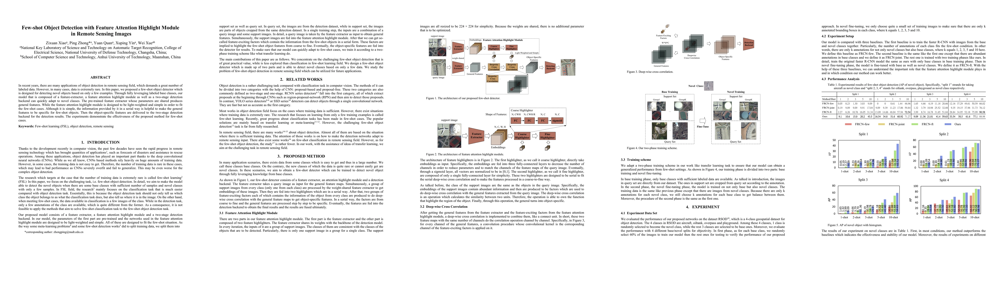 This paper presents a few-shot object detector for remote sensing images that adapts to novel objects using only a few labeled examples. The proposed model combines a feature extractor, a lightweight feature attention highlight module, and a two-stage detection backend to efficiently detect new objects. Experimental results show the method's effectiveness in few-shot scenarios.