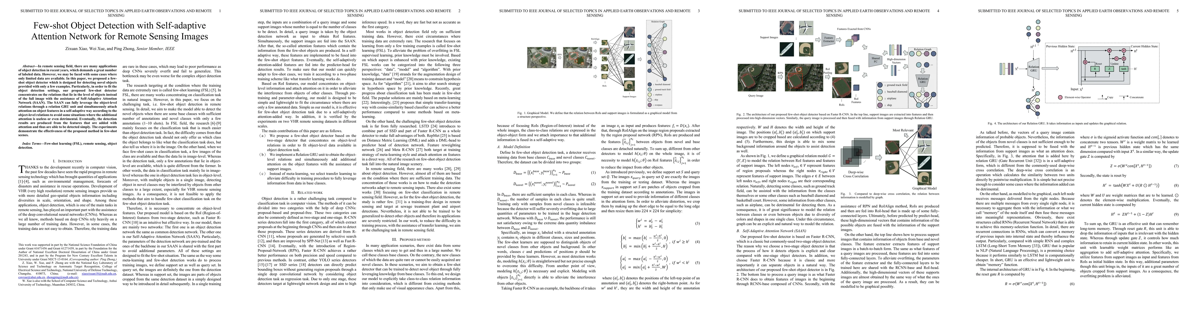 This paper proposes a few-shot object detector for remote sensing images, utilizing a Self-Adaptive Attention Network (SAAN) to focus on object-level relations and features, enhancing detection with limited labeled data. Experiments show the method's effectiveness in detecting novel objects with few examples.