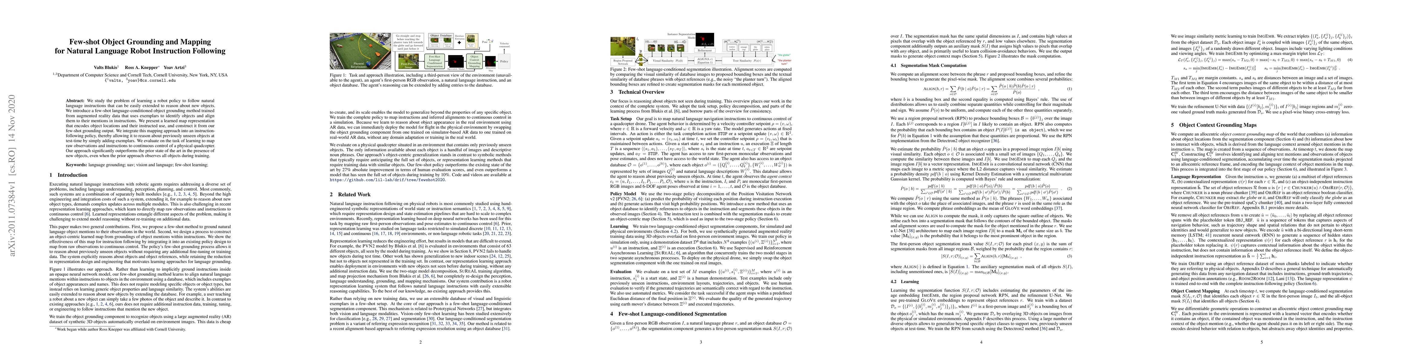 This paper introduces a few-shot language-conditioned object grounding method that allows robots to reason about new objects from natural language instructions. The approach significantly outperforms the prior state of the art in instruction following tasks.