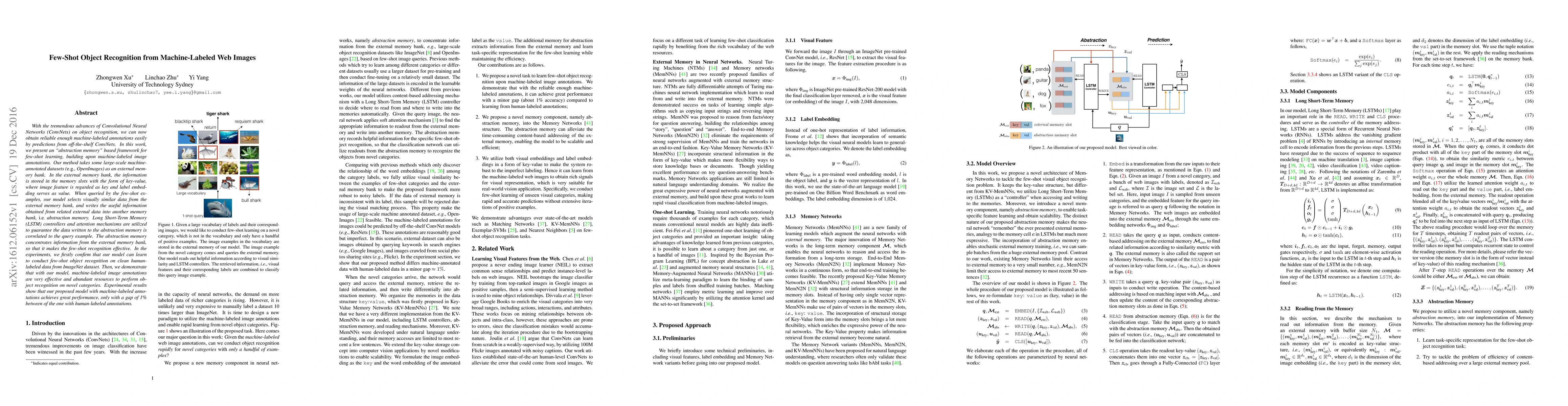This paper proposes a framework for few-shot object recognition using machine-labeled web images, leveraging abstraction memory and LSTM controllers. The model utilizes large-scale machine-annotated datasets as an external memory bank, selecting and abstracting relevant information to perform effective few-shot recognition, achieving near-human performance levels.