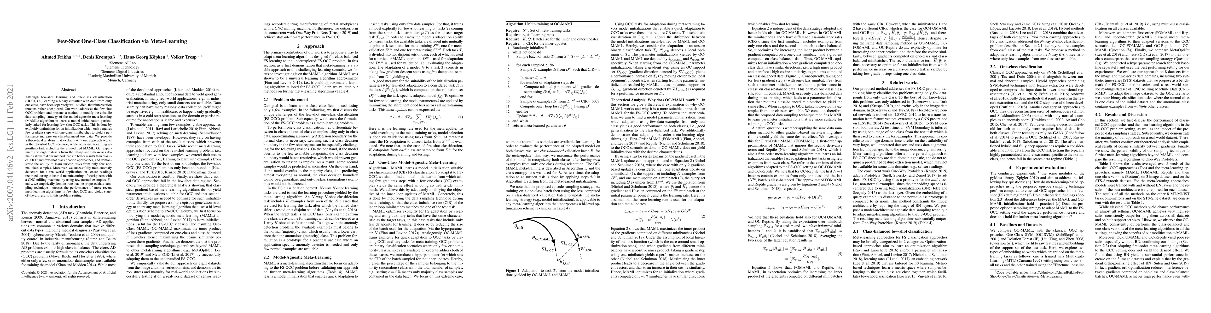 Although few-shot learning and one-class classification (OCC), i.e., learning a binary classifier with data from only one class, have been separately well studied, their intersection remains rather unexplored. Our work addresses the few-shot OCC problem and presents a method to modify the episodic data sampling strategy of the model-agnostic meta-learning (MAML) algorithm to learn a model initialization particularly suited for learning few-shot OCC tasks. This is done by explicitly optimizing for an initialization which only requires few gradient steps with one-class minibatches to yield a performance increase on class-balanced test data. We provide a theoretical analysis that explains why our approach works in the few-shot OCC scenario, while other meta-learning algorithms fail, including the unmodified MAML. Our experiments on eight datasets from the image and time-series domains show that our method leads to better results than classical OCC and few-shot classification approaches, and demonstrate the ability to learn unseen tasks from only few normal class samples. Moreover, we successfully train anomaly detectors for a real-world application on sensor readings recorded during industrial manufacturing of workpieces with a CNC milling machine, by using few normal examples. Finally, we empirically demonstrate that the proposed data sampling technique increases the performance of more recent meta-learning algorithms in few-shot OCC and yields state-of-the-art results in this problem setting.