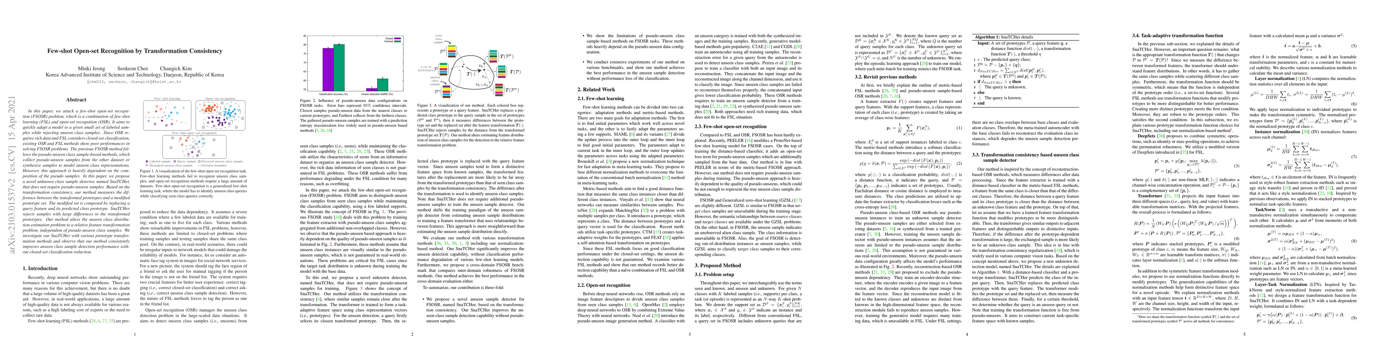 This paper proposes a novel method, SnaTCHer, for few-shot open-set recognition that detects unknown classes without relying on pseudo-unseen samples. It uses transformation consistency to measure differences between transformed prototypes and a modified prototype set, improving unseen class detection performance.