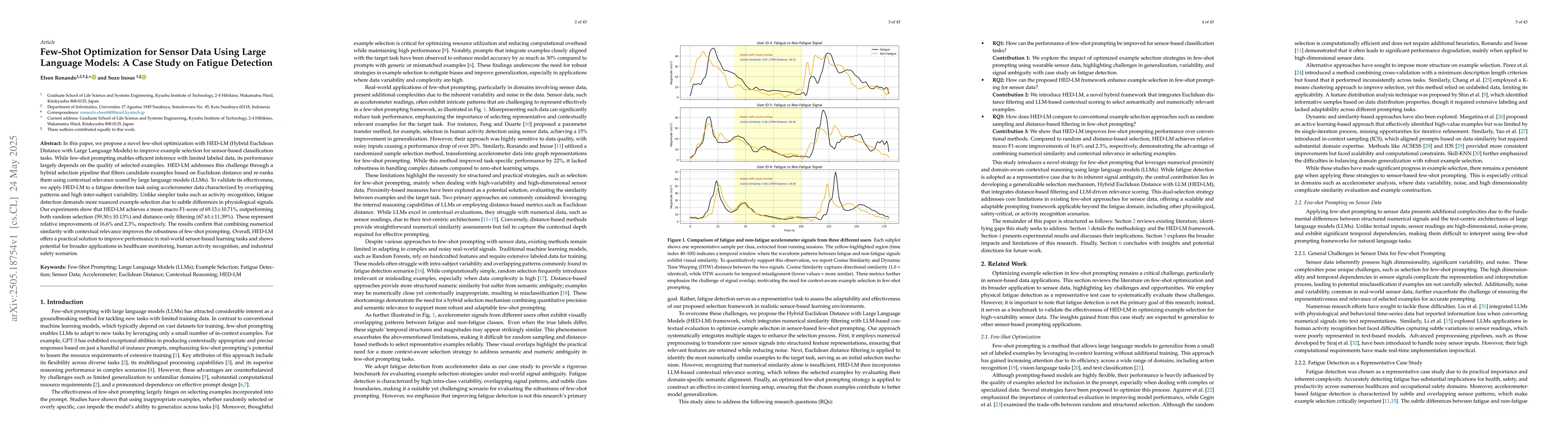 In this paper, we propose a novel few-shot optimization with HED-LM (Hybrid Euclidean Distance with Large Language Models) to improve example selection for sensor-based classification tasks. While few-shot prompting enables efficient inference with limited labeled data, its performance largely depends on the quality of selected examples. HED-LM addresses this challenge through a hybrid selection pipeline that filters candidate examples based on Euclidean distance and re-ranks them using contextual relevance scored by large language models (LLMs). To validate its effectiveness, we apply HED-LM to a fatigue detection task using accelerometer data characterized by overlapping patterns and high inter-subject variability. Unlike simpler tasks such as activity recognition, fatigue detection demands more nuanced example selection due to subtle differences in physiological signals. Our experiments show that HED-LM achieves a mean macro F1-score of 69.13$\pm$10.71%, outperforming both random selection (59.30$\pm$10.13%) and distance-only filtering (67.61$\pm$11.39%). These represent relative improvements of 16.6% and 2.3%, respectively. The results confirm that combining numerical similarity with contextual relevance improves the robustness of few-shot prompting. Overall, HED-LM offers a practical solution to improve performance in real-world sensor-based learning tasks and shows potential for broader applications in healthcare monitoring, human activity recognition, and industrial safety scenarios.