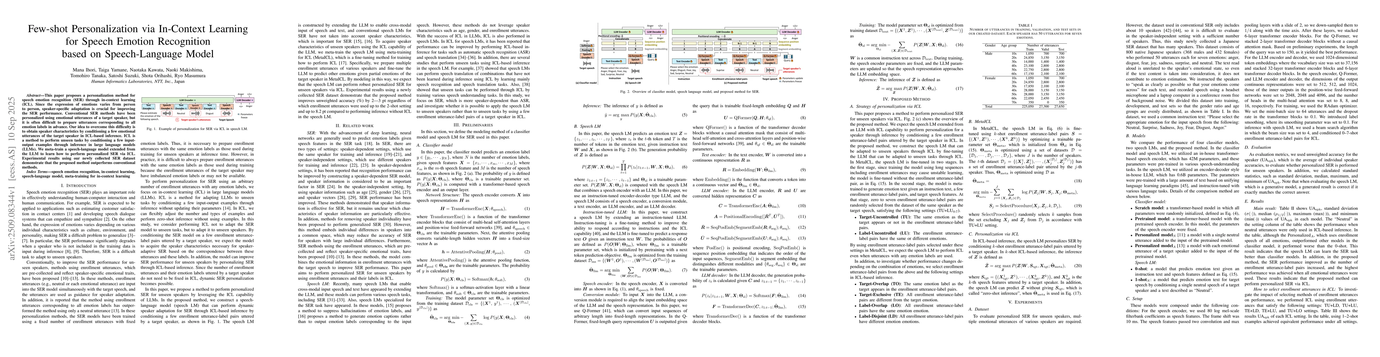 This paper proposes a personalization method for speech emotion recognition (SER) through in-context learning (ICL). Since the expression of emotions varies from person to person, speaker-specific adaptation is crucial for improving the SER performance. Conventional SER methods have been personalized using emotional utterances of a target speaker, but it is often difficult to prepare utterances corresponding to all emotion labels in advance. Our idea to overcome this difficulty is to obtain speaker characteristics by conditioning a few emotional utterances of the target speaker in ICL-based inference. ICL is a method to perform unseen tasks by conditioning a few input-output examples through inference in large language models (LLMs). We meta-train a speech-language model extended from the LLM to learn how to perform personalized SER via ICL. Experimental results using our newly collected SER dataset demonstrate that the proposed method outperforms conventional methods.