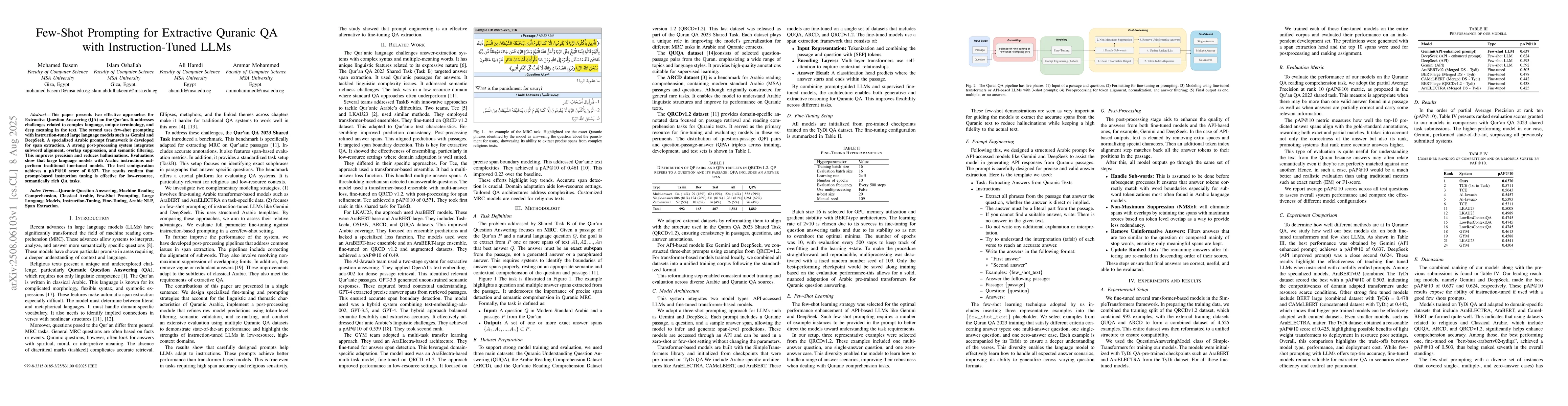This paper presents two effective approaches for Extractive Question Answering (QA) on the Quran. It addresses challenges related to complex language, unique terminology, and deep meaning in the text. The second uses few-shot prompting with instruction-tuned large language models such as Gemini and DeepSeek. A specialized Arabic prompt framework is developed for span extraction. A strong post-processing system integrates subword alignment, overlap suppression, and semantic filtering. This improves precision and reduces hallucinations. Evaluations show that large language models with Arabic instructions outperform traditional fine-tuned models. The best configuration achieves a pAP10 score of 0.637. The results confirm that prompt-based instruction tuning is effective for low-resource, semantically rich QA tasks.