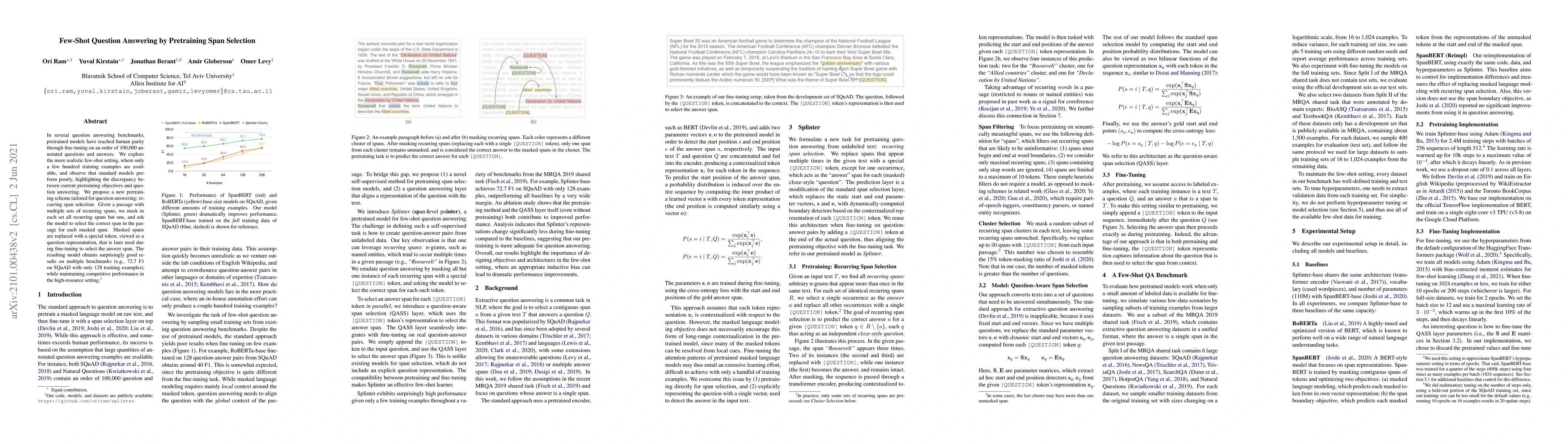 This paper proposes a new pretraining method called recurring span selection for few-shot question answering, achieving competitive results on benchmarks like SQuAD with minimal training data (128 examples). The method involves masking multiple spans in a passage and training the model to select the correct span, enhancing its performance in low-resource settings.