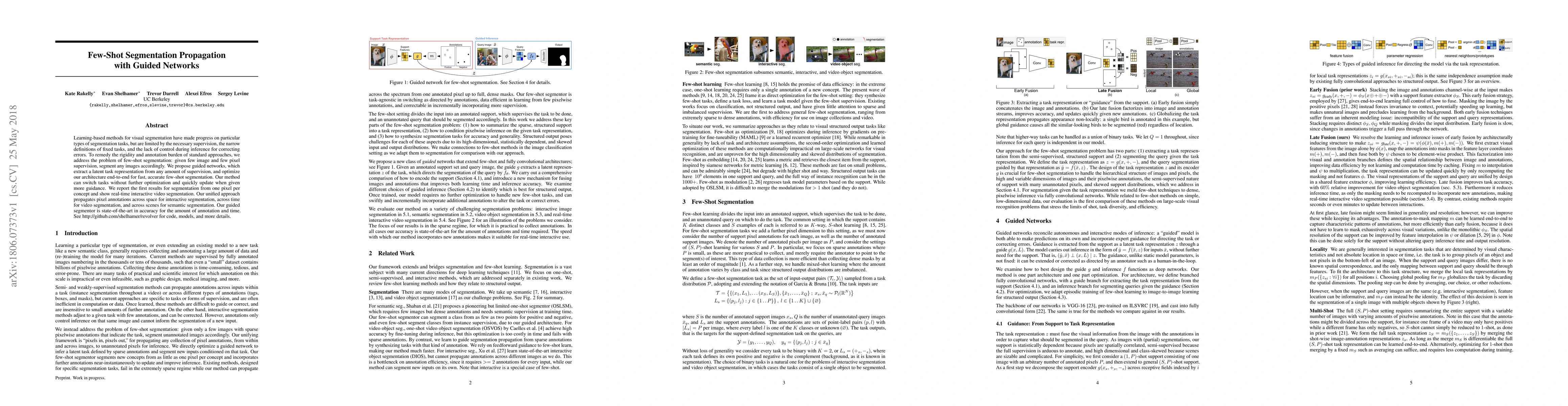 This paper proposes guided networks for few-shot segmentation, enabling accurate segmentation with minimal supervision. The method extracts latent task representations and optimizes end-to-end for fast, adaptive segmentation, achieving state-of-the-art performance with minimal annotations.
