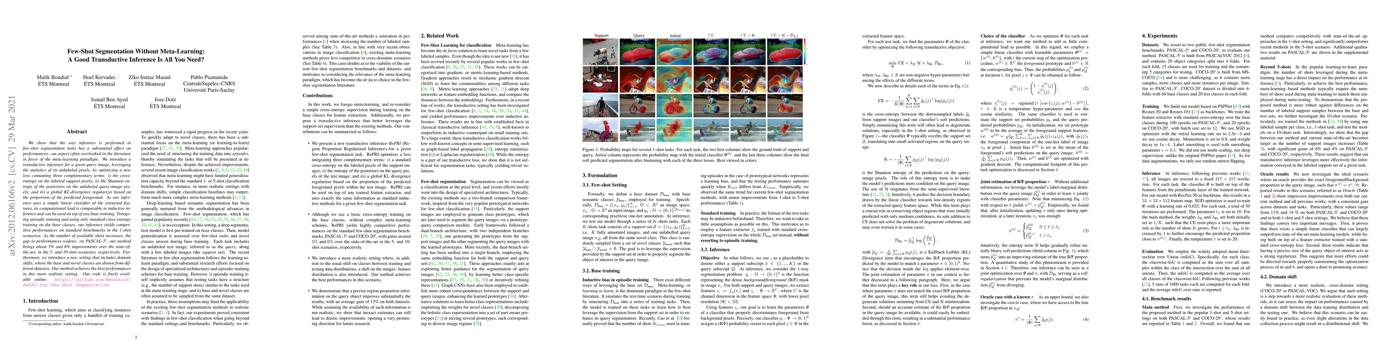 We show that the way inference is performed in few-shot segmentation tasks has a substantial effect on performances -- an aspect often overlooked in the literature in favor of the meta-learning paradigm. We introduce a transductive inference for a given query image, leveraging the statistics of its unlabeled pixels, by optimizing a new loss containing three complementary terms: i) the cross-entropy on the labeled support pixels; ii) the Shannon entropy of the posteriors on the unlabeled query-image pixels; and iii) a global KL-divergence regularizer based on the proportion of the predicted foreground. As our inference uses a simple linear classifier of the extracted features, its computational load is comparable to inductive inference and can be used on top of any base training. Foregoing episodic training and using only standard cross-entropy training on the base classes, our inference yields competitive performances on standard benchmarks in the 1-shot scenarios. As the number of available shots increases, the gap in performances widens: on PASCAL-5i, our method brings about 5% and 6% improvements over the state-of-the-art, in the 5- and 10-shot scenarios, respectively. Furthermore, we introduce a new setting that includes domain shifts, where the base and novel classes are drawn from different datasets. Our method achieves the best performances in this more realistic setting. Our code is freely available online: https://github.com/mboudiaf/RePRI-for-Few-Shot-Segmentation.
