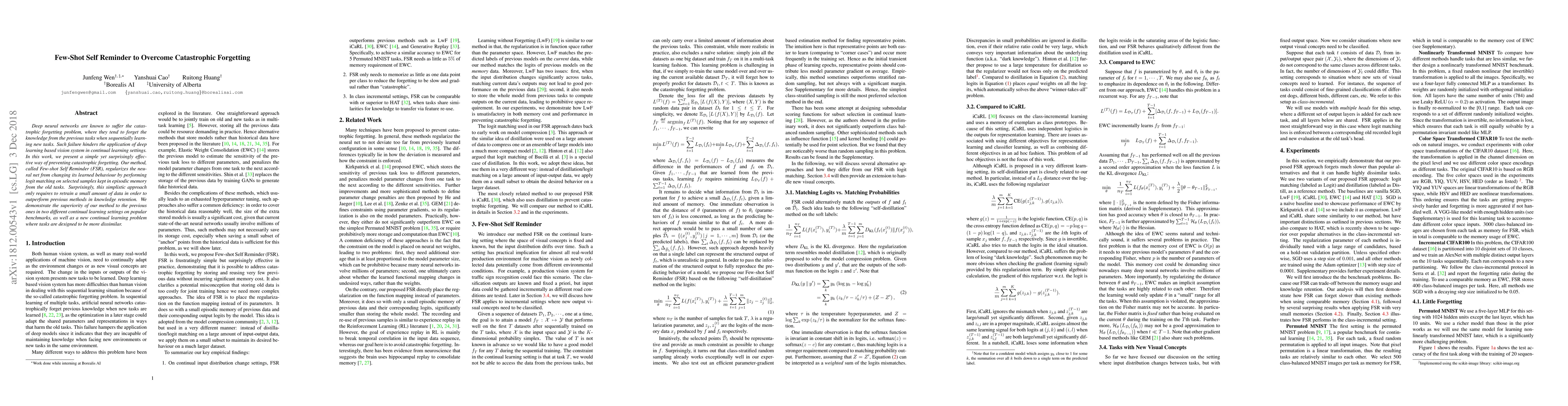 This paper introduces Few-Shot Self Reminder (FSR), a method to prevent catastrophic forgetting in deep neural networks by using logit matching on episodic memory samples from old tasks. FSR requires minimal retraining data and outperforms previous methods in continual learning settings on popular benchmarks.