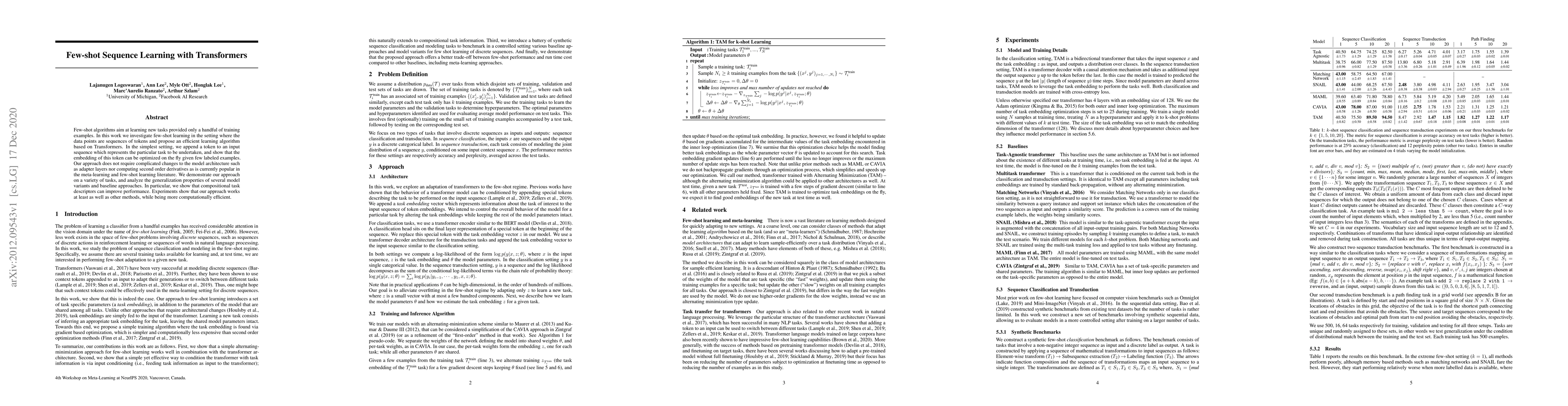 This paper proposes a simple yet efficient few-shot learning algorithm for sequence data using Transformers, optimizing task-specific embeddings with minimal architectural changes. The method demonstrates competitive performance and better computational efficiency compared to other approaches.