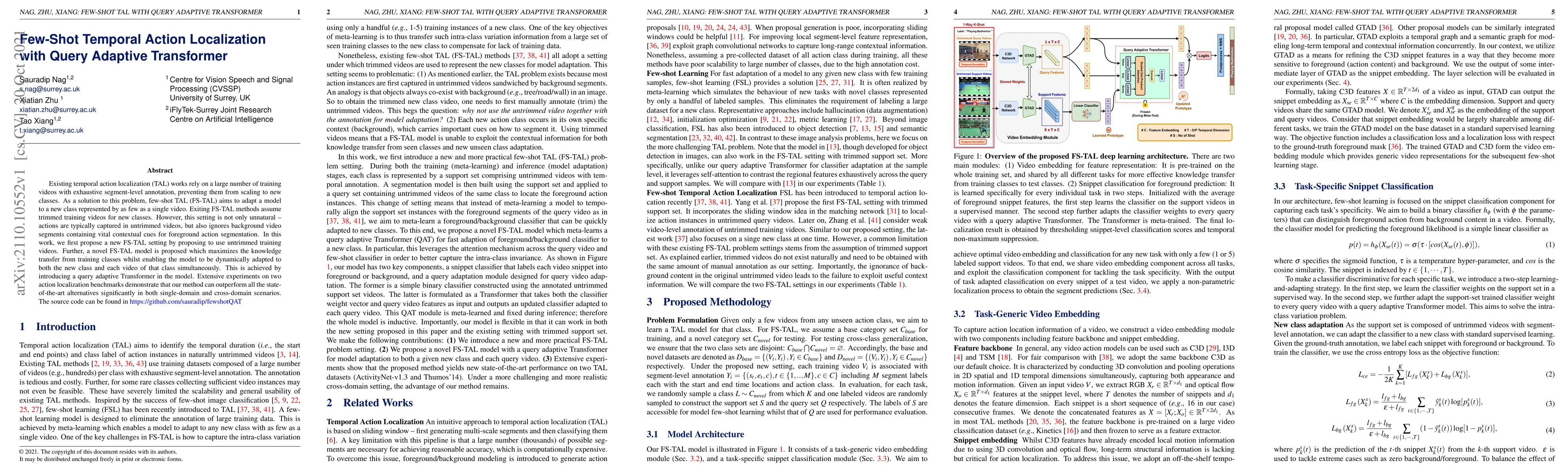 Existing temporal action localization (TAL) works rely on a large number of training videos with exhaustive segment-level annotation, preventing them from scaling to new classes. As a solution to this problem, few-shot TAL (FS-TAL) aims to adapt a model to a new class represented by as few as a single video. Exiting FS-TAL methods assume trimmed training videos for new classes. However, this setting is not only unnatural actions are typically captured in untrimmed videos, but also ignores background video segments containing vital contextual cues for foreground action segmentation. In this work, we first propose a new FS-TAL setting by proposing to use untrimmed training videos. Further, a novel FS-TAL model is proposed which maximizes the knowledge transfer from training classes whilst enabling the model to be dynamically adapted to both the new class and each video of that class simultaneously. This is achieved by introducing a query adaptive Transformer in the model. Extensive experiments on two action localization benchmarks demonstrate that our method can outperform all the state of the art alternatives significantly in both single-domain and cross-domain scenarios. The source code can be found in https://github.com/sauradip/fewshotQAT