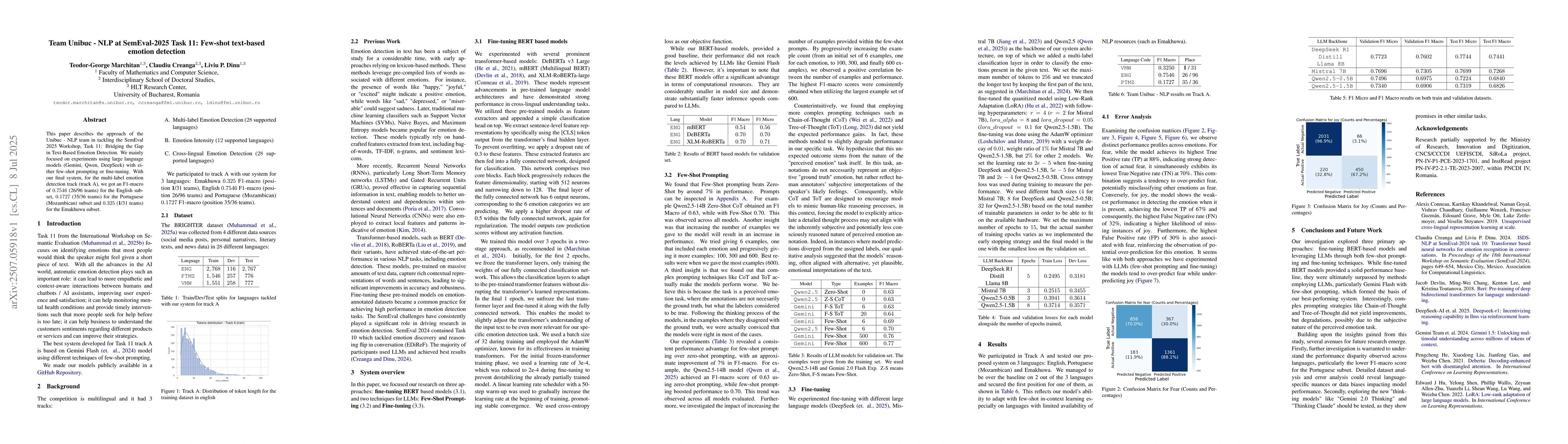 This paper describes the approach of the Unibuc - NLP team in tackling the SemEval 2025 Workshop, Task 11: Bridging the Gap in Text-Based Emotion Detection. We mainly focused on experiments using large language models (Gemini, Qwen, DeepSeek) with either few-shot prompting or fine-tuning. With our final system, for the multi-label emotion detection track (track A), we got an F1-macro of $0.7546$ (26/96 teams) for the English subset, $0.1727$ (35/36 teams) for the Portuguese (Mozambican) subset and $0.325$ (\textbf{1}/31 teams) for the Emakhuwa subset.