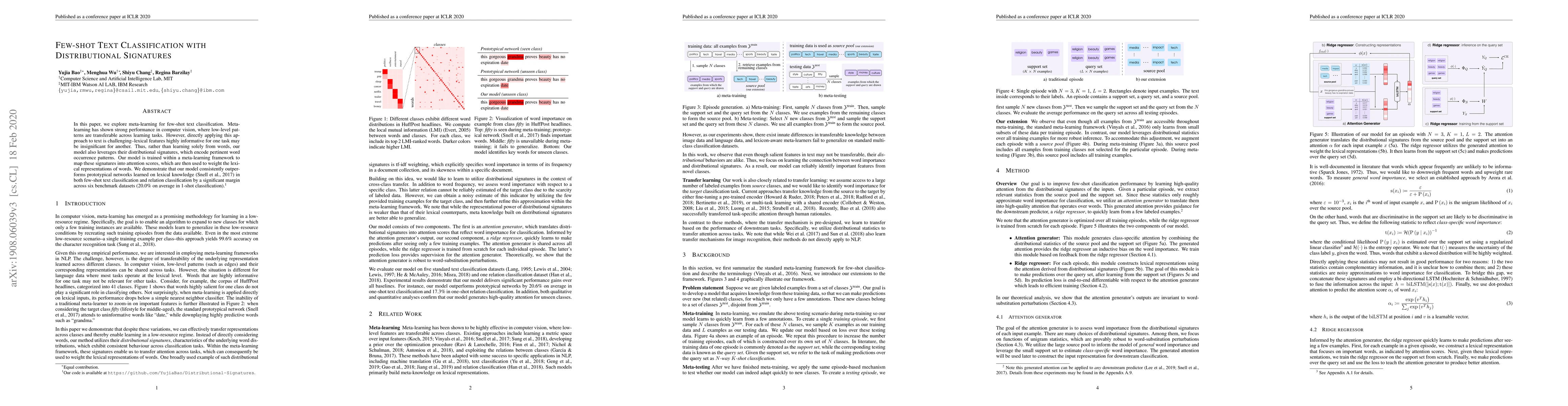 This paper presents a meta-learning approach for few-shot text classification, utilizing distributional signatures of words to encode occurrence patterns beyond lexical features. The proposed model outperforms traditional prototypical networks, achieving a 20.0% average improvement in 1-shot classification across six datasets.