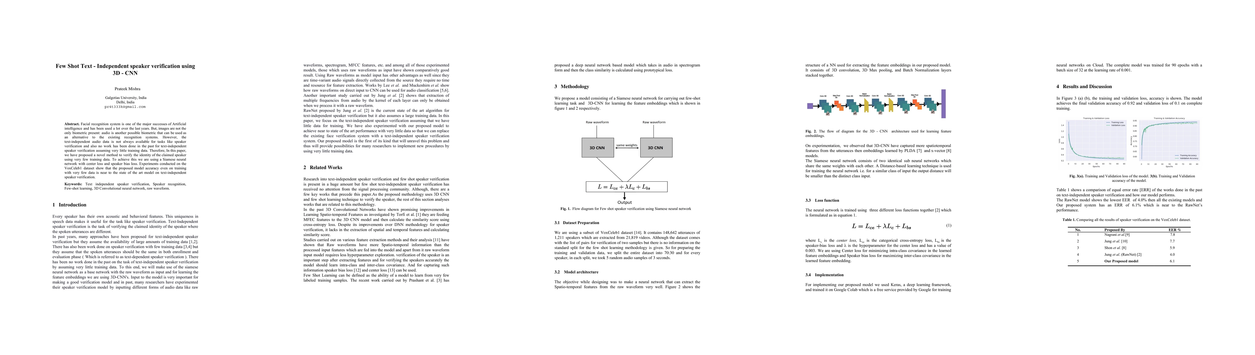 This paper proposes a novel few-shot text-independent speaker verification method using a 3D-CNN with a Siamese neural network incorporating center loss and speaker bias loss. Experiments on VoxCeleb1 demonstrate competitive accuracy even with minimal training data.