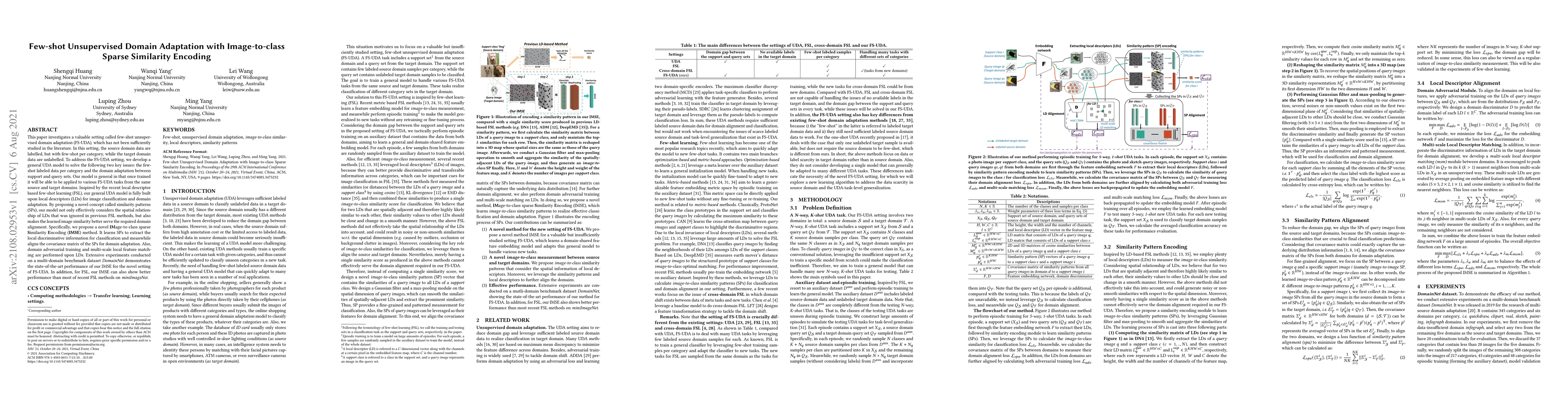 This paper introduces a novel model for few-shot unsupervised domain adaptation (FS-UDA) using sparse similarity encoding, addressing the challenges of limited labeled data and domain shift. The proposed IMage-to-class sparse Similarity Encoding (IMSE) method leverages local descriptors and similarity patterns to enhance classification and domain alignment, achieving state-of-the-art results on DomainNet and improved performance on miniImageNet for few-shot learning.